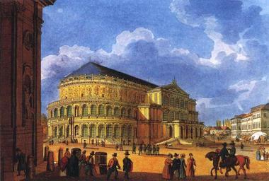 | Keywords: Erstes Opernhaus Sempers ca1850 1860.jpg en The first opera house of Semper in Dresden around 1850 de Das erste Opernhaus Sempers in Dresden ca 1850 Kolorierter Kupferstich von Carl Täubert D Syndram Die Rückkehr des Dresdner Schlosses edition Sächsische Zeitung 2006 S 88 Carl Täubert ~ 1850 PD-old-100-1923 Königliches Hoftheater Dresden |