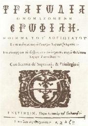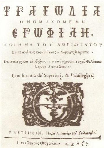 Keywords: Erwfili exwfyllo.jpg en Cover of Erofili Εξώφυλλο της Ερωφίλης α ό την έκδοση του 1637 Transferred from http //el wikipedia org el wikipedia; transferred to Commons by User MARKELLOS using http //tools wikimedia de/~magnus/commonshelper php CommonsHelper 1637 author This image is in the public domain PD-old-100 Original upload log page el wikipedia Erwfili_exwfyllo jpg 2007-01-27 20 09 Elena153 337480 38966 bytes <nowiki>Εξώφυλλο της Ερωφίλης α ό την έκδοση του 1637</nowiki> Greek literature Title pages |