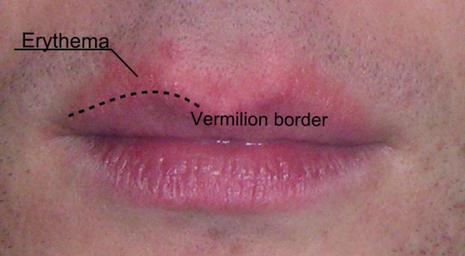 Keywords: Erythema around the lips.png Erythema above the lips appeared concomitantly with chapped lips due to exposure to very cold temperature own Mikael Häggström 2010-12-02 thumb left Unlabeled Erythemas Lip disorders