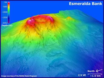 | Keywords: Esmeralda 3d hires.jpg en Esmeralda Bank submarine volcano looking toward the southeast Depths in this image range from 54 to 2052 meters 177 to 6730 feet Image is two times vertically exaggerated EM300 bathymetry data ~25 meter resolution overlaid on SeaBat data ~50 meter resolution Distance indicated is kilometers in foreground SeaBat data courtesy of Yoshihiko Tamura JAMSTEC Image courtesy of Submarine Ring of Fire 2006 Exploration NOAA Vents Program 2006-03-21 09 42 23 http //oceanexplorer noaa gov/explorations/06fire/background/marianaarc/media/hirez/esmeralda_3d_hires jpg noaa gov Vents program http //www pmel noaa gov/eoi/about-us other versions PD-USGov Volcanoes of the Northern Mariana Islands Active volcanoes Seamounts of the Northern Mariana Islands Bathymetric maps of volcanoes Maps of volcanoes of the Pacific Ocean PD US NOAA |