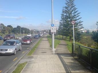 | Keywords: Esmonde Road Strange Split Pathways.jpg en A split pedestrian and cycle path alongside the edge of the motorway interchange on the Shore Looking west along Esmonde Road Note the VERY confusing signage which makes it absolutely unclear which side bikes and pedestrians are to go on 2011-08 own Ingolfson other versions cc-zero Streets in Auckland Bikeways in Auckland Takapuna Walking paths in New Zealand Road signs in New Zealand Street trees in New Zealand No stopping markings in New Zealand |