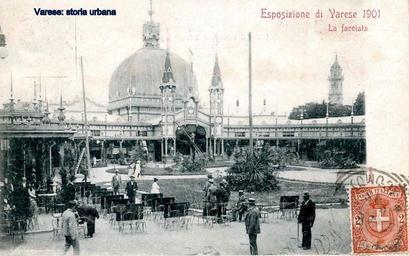 Keywords: Dietro la cupola è visibile palazzo Estense, a destra il campanile di San Vittore. varese giardinipubblici esposizione1901