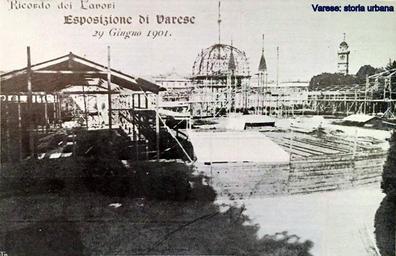 Keywords: I lavori di costruzione dei padiglioni e della grande cupola. A destra il campanile di San Vittore. varese giardinipubblici esposizione1901
