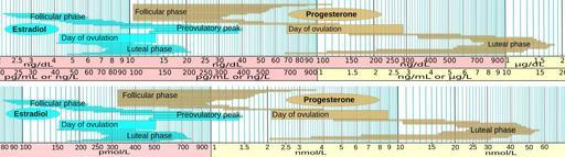 | Keywords: Estradiol and progesterone in menstrual cycle.svg Reference ranges for estradiol and progesterone throughout the menstrual cycle Detail from picture in en Reference ranges for blood tests The y-axis represent time throughout the menstrual cycle with one block corresponding to one day However progesterone and estrogen currently follow different y-axes Reference Values taken from day 1 after LH surge in http //www ncbi nlm nih gov/pubmed/16776638 Establishment of detailed reference values for luteinizing hormone follicle stimulating hormone estradiol and progesterone during different phases of the menstrual cycle on the Abbott ARCHITECT analyzer Reto Stricker Raphael Eberhart Marie-Christine Chevailler Frank A Quinn Paul Bischof and Rene´ Stricker Clin Chem Lab Med 2006;44 7 883 “887 PMID 16776638 Alternative link http //www dianalabs ch/documents/ajouts/Hormones pdf Own Mikael Häggström 2009-11-06 See also thumb left LH and FSH - Blood values Follicle-stimulating hormone |