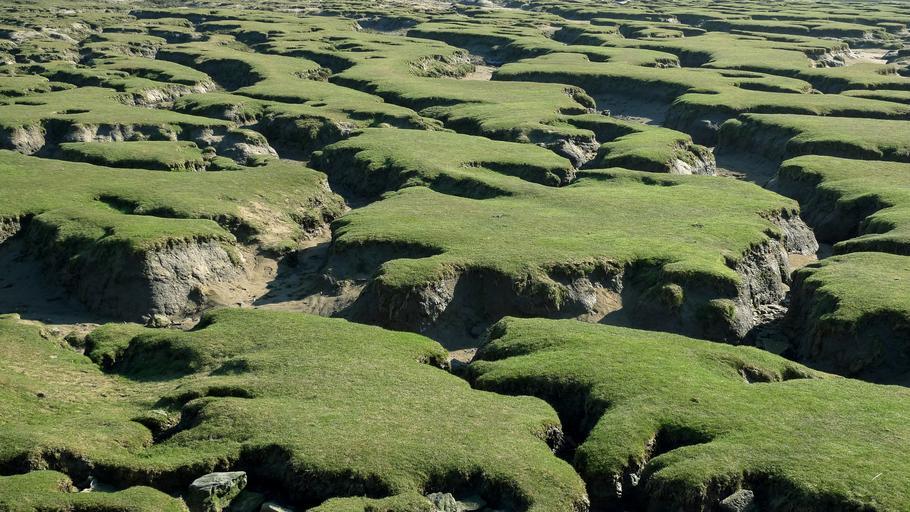 Keywords: estuary mud foreshore seashore littoral intertidal low tide tide shore pattern brackish channels green brown grass muddy delta