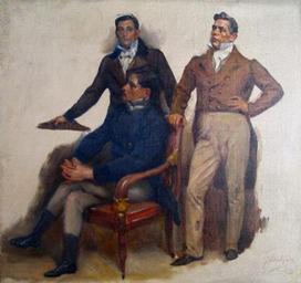 View Original:Estudo de figuras humanas para a tela Cortes Constituintes de 1821 (José Ferreira de Moura, Agostinho José Freire, Manuel Borges Carneiro) - Veloso Salgado, 1920.png (442x416)