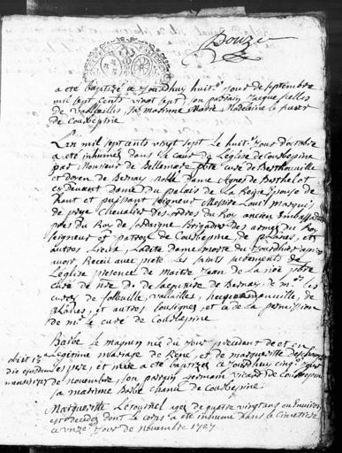 | Keywords: État civil Courbépine 1727 p.448.jpg en Excerpt of the vital records of Courbépine of 1727 Note of the burial of Jeanne-Agnès Berthelot de Pléneuf marquise de Plasnes de Auszug aus dem Personenstandsregister von Courbépine aus dem Jahr 1727 Vermerk zur Beerdigung von Jeanne-Agnès Berthelot de Pléneuf marquise de Plasnes die genannte Dame verstarb am Vortag nachdem sie mit Frömmigkeit die Sterbesakramente empfangen hatte fr Extrait de l'état civil de Courbépine contenant le 8 Octobre 1727 note de l'inhumation de Jeanne-Agnès Berthelot de Pléneuf marquise de Plasnes http //archives cg27 fr/pleade/search-etatcivil-net xsp commune Courb C3 A9pine+ 28Eure 2C+France 29 paroisse bdate 1726 edate 1728 typedoc registre id etatcivil-form base fa-tmp base fa req subsets 3Aetatcivil 2F archives cg27 fr Parish of Courbépine 1727 Jeanne Agnès Berthelot de Pléneuf Plasnes Courbépine Parish registers 1727 documents PD-old-100 |