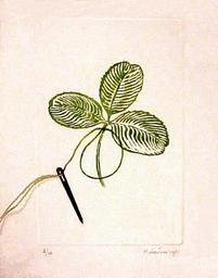 | Keywords: etching stitching drawing etching.plate etchingplate real.thread realthread hubertine-heijermans hubertineheijermans artist.printmaker artistprintmaker on.paper onpaper tiny.edition tinyedition printed.by.artist printedbyartist 1981 printed.by.hand printedbyhand press.bendini pressbendini The needle was also etched but was bitten by the nitric acid for a longer time, while the etching plate around it was covered with a layer of tar varnish. The real thread is an invention of the artist that nobody else had done yet. A clover of 4 leaves brings luck, no? En français; cette eau-forte a été exécutée sur une seule plaque et seulement un fil a été posé, en perçant la feuille du papier, formant le bout de la 4me feuille. Le fil sort et dépasse donc le bord du papier. L'aiguille était mordue très longtemps par l'acide nitrique, tandis que la plaque était couverte et protégée par une couche de bitume ou goudron. The needle was also etched but was bitten by the nitric acid for a longer time, while the etching plate around it was covered with a layer of tar varnish. The real thread is an invention of the artist that nobody else had done yet. A clover of 4 leaves brings luck, no? En français; cette eau-forte a été exécutée sur une seule plaque et seulement un fil a été posé, en perçant la feuille du papier, formant le bout de la 4me feuille. Le fil sort et dépasse donc le bord du papier. L'aiguille était mordue très longtemps par l'acide nitrique, tandis que la plaque était couverte et protégée par une couche de bitume ou goudron. |