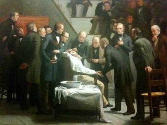 | Keywords: Ether Day, or The First Operation with Ether by Robert C. Hinckley.jpg accession number creator Robert C Hinckley 1882-1893 96 x 115 Francis A Countway Library of Medicine Harvard University oil on canvas http //www health harvard edu/blog/painkillers-and-drug-addiction-an-ongoing-dilemma-20101027677/ether en People in the painting left to right 1 Newspaper reporter 2 John Call Dalton 3 William Williamson Wellington 4 Abel Lawrence Peirson 5 Charles Hosea hildreth 6 William Thomas Green Morton 7 Jonathan Mason Warren 8 Gilbert Abbott 9 John Collins Warren 10 Eben H Frost 11 Charles Frederick Heywood 12 Henery Jacob Bigelow 13 Augustus Addison Gould 14 Solomon Davis Townsend Source http //neurosurgery mgh harvard edu/History/hinkley htm 1882-1893 http //www health harvard edu/blog/painkillers-and-drug-addiction-an-ongoing-dilemma-20101027677/ether Robert C Hinckley 1853-1941 other versions PD-Art Robert C Hinckley Ether Day 19th-century medicine in painting Harvard Medical School |