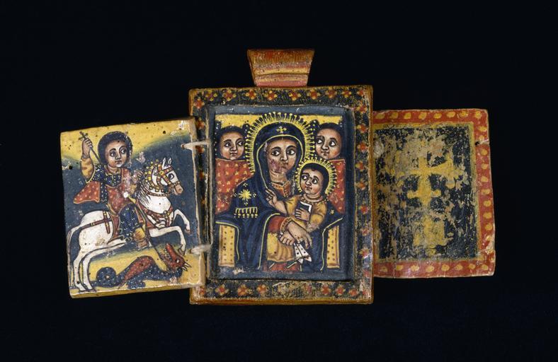 | Keywords: Ethiopian - Front of a Double-Sided Diptych with Mary and Her Son, and Saint George - Walters 365 - Side A.jpg This small icon was worn around the neck to ward off evil; it could be hung with either side facing out This is a small replica of the famous icon known as the Kwerata Reesu Christ with the Crown of Thorns believed to protect the whole kingdom of Ethiopia Allegiance to the emperor was sworn on the Kwerata Reesu and it accompanied him on military expeditions late Other date century 18 Gondarine tempera wood H with one panel open 3 7/16 x W 4 x D 5/8 in 8 7 x 10 1 x 1 55 cm ; H with two panels open 3 7/16 x W 5 9/16 x D 5/8 in 8 7 x 14 1 x 1 55 cm ; Closed cm 8 7 6 2 1 55 ; Center panel cm 8 89 6 35 ; Folding panels cm 5 87 4 76 accession number 36 5 35663 Knopfelmacher Collection New York date and mode of acquisition unknown Knopfelmacher 1 William Wright Gallery New York date and mode of acquisition unknown Walters Art Museum 1996 by purchase Museum purchase with funds provided by the W Alton Jones Foundation Acquisition Fund 1996 Ethiopian Art at The Walters The Walters Art Gallery Baltimore 1996 Realms of Faith Medieval and Byzantine Art from the Walters Art Museum Frist Center for the Visual Arts Nashville 2001-2002 Realms of Faith Medieval and Byzantine Art from the Walters Art Museum Frist Center for the Visual Arts Nashville 2002-2005 Angels of Light Ethiopian Art from the Walters Art Museum Birmingham Museum of Art Birmingham; Smith College Museum of Art Northampton; Museum of Biblical Art New York 2006-2007 place of origin Gondar Ethiopia Walters Art Museum license 3D Art of Ethiopia in the Walters Art Museum Church paintings in Ethiopia Paintings in the Walters Art Museum Media contributed by the Walters Art Museum needs category review |