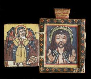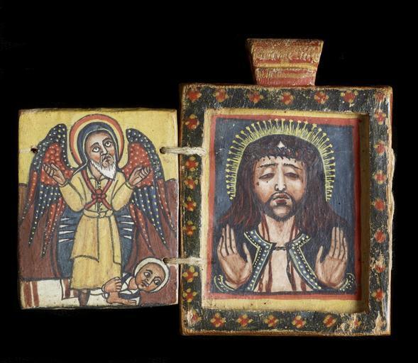 | Keywords: Ethiopian - Front of a Double-Sided Diptych with Mary and Her Son, and Saint George - Walters 365 - Open B.jpg This small icon was worn around the neck to ward off evil; it could be hung with either side facing out This is a small replica of the famous icon known as the Kwerata Reesu Christ with the Crown of Thorns believed to protect the whole kingdom of Ethiopia Allegiance to the emperor was sworn on the Kwerata Reesu and it accompanied him on military expeditions late Other date century 18 Gondarine tempera wood H with one panel open 3 7/16 x W 4 x D 5/8 in 8 7 x 10 1 x 1 55 cm ; H with two panels open 3 7/16 x W 5 9/16 x D 5/8 in 8 7 x 14 1 x 1 55 cm ; Closed cm 8 7 6 2 1 55 ; Center panel cm 8 89 6 35 ; Folding panels cm 5 87 4 76 accession number 36 5 35663 Knopfelmacher Collection New York date and mode of acquisition unknown Knopfelmacher 1 William Wright Gallery New York date and mode of acquisition unknown Walters Art Museum 1996 by purchase Museum purchase with funds provided by the W Alton Jones Foundation Acquisition Fund 1996 Ethiopian Art at The Walters The Walters Art Gallery Baltimore 1996 Realms of Faith Medieval and Byzantine Art from the Walters Art Museum Frist Center for the Visual Arts Nashville 2001-2002 Realms of Faith Medieval and Byzantine Art from the Walters Art Museum Frist Center for the Visual Arts Nashville 2002-2005 Angels of Light Ethiopian Art from the Walters Art Museum Birmingham Museum of Art Birmingham; Smith College Museum of Art Northampton; Museum of Biblical Art New York 2006-2007 place of origin Gondar Ethiopia Walters Art Museum license 3D Art of Ethiopia in the Walters Art Museum Church paintings in Ethiopia Paintings in the Walters Art Museum Media contributed by the Walters Art Museum needs category review |