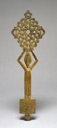 | Keywords: Ethiopian - Hand Cross with Figure - Walters 61340.jpg Hand crosses incorporating human figures are extremely rare and appear to have been executed exclusively in wood Such figures are sometimes identified as Christ or Adam As is typical when human forms are carved as part of the shaft the torso and legs of the figure double as the handle of the cross The material used in creating this type of cross which was often carved by the priest who used it evoked the wood of the cross upon which Christ was crucified The elaborate interlace of the cross the figure holds must have presented a considerable challenge to the carver as it had to be created without compromising the structural integrity of the whole piece Created by drilling holes through the wood and carving linear elements into its surface this design transformed the overall shape of the cross into a delicate web The rectangular base may be interpreted as a reference to the tabot or carved altar box venerated by Ethiopian Christians century 18 19 Early Modern carved wood cm 34 10 7 1 4 accession number 61 340 26771 Knopfelmacher Collection New York William Wright Gallery New York 1991 Nancy and Robert Nooter Collection date and mode of acquisition unknown Walters Art Museum Gift of Nancy and Robert Nooter 1997 Realms of Faith Medieval and Byzantine Art from the Walters Art Museum Frist Center for the Visual Arts Nashville 2001-2002 Angels of Light Ethiopian Art from the Walters Art Museum Birmingham Museum of Art Birmingham; Smith College Museum of Art Northampton; Museum of Biblical Art New York 2006-2007 place of origin Ethiopia Walters Art Museum license Art of Ethiopia in the Walters Art Museum Crosses from Ethiopia Media contributed by the Walters Art Museum needs category review |