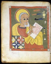 | Keywords: Ethiopian - Leaf from Gunda Gunde Gospels - Walters W85096V - Open Reverse.jpg ca 1540 Stephanite parchment with ink and tempera paint cm 30 24 5 accession number W 850 96V 26726 Church Mädhane Aläm at Mäjate Ethiopia 1892-1893 mode of acquisition unknown Private collection France prior to 1973 mode of acquisition unknown Sam Fogg London date and mode of acquisition unknown Walters Art Museum 1998 by purchase Museum purchase with funds provided by the W Alton Jones Foundation Acquisition Fund 1998 Illuminating the Word Gospel Books in the Middle Ages The Walters Art Museum Baltimore 2004 The Saint John's Bible A Modern Vision through Medieval Methods The Walters Art Museum Baltimore 2009 place of origin Ethiopia Walters Art Museum license 2D Walters MS W850 - Ethiopian Gunda Gunde Gospels Unidentified Saints |