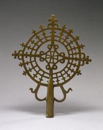 | Keywords: Ethiopian - Processional Cross - Walters 542890.jpg This cross which survives in nearly pristine condition was cast in one piece with the base and body formed of the same material The high degree of perforation creating a radiating lattice of crosses would have been difficult to achieve in any other medium Because of its inherent strength bronze was ideally suited to this kind of treatment The design is rigorously geometric dominated by the interaction of circular and cruciform shapes The curving ribbons enclosing the central cross differentiate this space from the concentric rings around it The central cross therefore remains the focus of the object and is further distinguished by its open-work construction The many small crosses radiating from the hub of this wheel-like form allude to the symbolic regenerative properties of the cross The form of this wheel cross is common to the province of Lasta site of the churches of Lalibala century 14 15 Solomonic cast bronze cm 22 54 17 62 accession number 54 2890 5913 Knopfelmacher Collection Knopfelmacher 12 New York William Wright Gallery New York Walters Art Museum 1996 by purchase Museum purchase with funds provided by the W Alton Jones Foundation Acquisition Fund 1996 Ethiopian Art at The Walters The Walters Art Gallery Baltimore 1996 Angels of Light Ethiopian Art from the Walters Art Museum Birmingham Museum of Art Birmingham; Smith College Museum of Art Northampton; Museum of Biblical Art New York 2006-2007 place of origin Lasta Ethiopia Walters Art Museum license Art of Ethiopia in the Walters Art Museum Crosses from Ethiopia Media contributed by the Walters Art Museum needs category review |