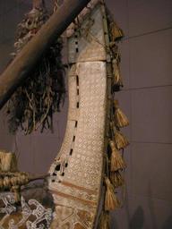 | Keywords: Ethnologisches Museum Dahlem Berlin Mai 2006 016.jpg Detail of a blue-ocean ship from Luf off the coast of Papua New Guinea This boat was constructed in 1890 and brought to Berlin in 1904 It was used by the native population of Luf for trade and warfare For longer journeys into the open sea it could transport up to 50 persons A platform was used to transport goods To stabilise the ship depending on the winds the crews would move to different locations on the ship the platform and a small bridge The ship itself was carved out of a single large treetrunk Plant adhesive was used for insulation against the water The whole ship was constructed without a single nail all parts are held together with plant material The rectangular sails are typical for the region but unusual for the wider Oceanic region This ship is the last of its kind and kept at the Ethnologisches Museum Berlin-Dahlem The population of Luf became extinct in 1940 own 2006-05 Gryffindor I release it into the public domain Ship from Luf Ethnological Museum Berlin |