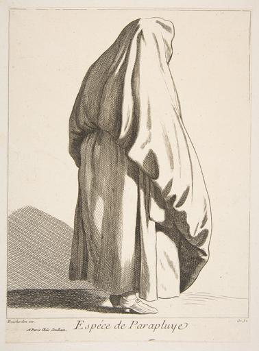 Keywords: Études prises dans le bas peuple ou les Cris de Paris - Espéce de Parapluye.jpg A Sort of Umbrella A woman wearing her overskirt over her head to shelter herself from the rain; she is seen standing in profile to the right 1746 Etching with some engraving image 8 9/16 x 6 3/4 in 21 8 x 17 1 cm sheet 9 1/4 x 6 13/16 in 23 5 x 17 3 cm Institution Metropolitan Museum of Art 3353866 object history exhibition history other versions 398356 Below image on left Bouchardon inv ; centered Espéce de Parapluye ; on right CxSx Bottom left A Paris Chés Joullain credit line Harris Brisbane Dick Fund 1953 accession number 53 600 588 60 PD-100 Études prises dans le bas peuple ou les Cris de Paris Etchings of Paris Etchings in the Metropolitan Museum of Art Images of Paris from the Metropolitan Museum of Art Umbrellas Peplums