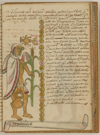 | Keywords: Etzalcualiztli, Meal of Maize and Beans, the Sixth Month of the Aztec Solar Calendar WDL6737.png Artwork ru Това Хуан де около 1546 г около 1626 г fr Tovar Jean de 1546-1626 env en Tovar Juan de circa 1546-circa 1626 zh 胡安·德·托瓦尔,约 1546 年 - 约 1626 年 pt Tovar Juan de por volta de 1546-por volta de 1626 ar خوان دو توفار، حوالي 1546-حوالي 1626 es Tovar Juan de circa 1546-circa 1626 ru Эцалькуалистли блюдо из маиса и фасоли 6-й месяц солнечного календа я ацтеков fr Etzalcualiztli repas de maïs et de haricots sixième mois du calendrier solaire aztèque en Etzalcualiztli Meal of Maize and Beans the Sixth Month of the Aztec Solar Calendar zh 阿兹特克太阳历的第 6 个 食豆黍粥 pt Etzalcualiztli Refeição de milho e feijões o sexto mês do calendário solar asteca ar اتسالكواليستلي، وجبة الذرة الصفراء والفاصوليا، الشهر السادس من التقويم الشمسي الأزتكي ru Кодекс Това а авто ом кото ого считается мексиканский иезуит XVI века Хуан де Това соде жит под обную инфо мацию об об ядах и це емониях ацтеков известных также как мешика Кодекс п оиллюст и ован 51 аква ельным исунком на полную ст аницу Рисунки в кото ых наблюдается значительное влияние пиктог афических укописей доколониальных в емен обладают исключительными художественными достоинствами Рукопись состоит из т ех азделов В пе вом азделе описана исто ия путешествий ацтеков до п ибытия испанцев Вто ой аздел п едставляет собой иллюст и ованную исто ию ацтеков В т етьем азделе находится календа ь Това а в кото ом п ослеживается календа ный цикл ацтеков с месяцами неделями днями воск есными буквами и елигиозными п аздниками х истианского 365-дневного года а этой иллюст ации из т етьего аздела изоб ажен бог ве оятно Тлалок или воплощающий его ж ец со стебелем маиса и сосудом с водой в уках Его глаза обведены зелеными к угами как и от на теле накидка ад ним на исован к аб В тексте описывается что это месяц абочих и низших классов; они выходят на улицы в подобной одежде чтобы напомнить всем кто обеспечивает их пищей Этот месяц оп еделяемый как начало июня по аст ологическому символу к аба или Рака называется эцалькуалистли блюдо из маиса и фасоли Богом-пок овителем этого месяца считался бог дождя Тлалок К ат ибутам Тлалока относятся учной сосуд с водой к уги вок уг глаз и та и стебель куку узы <br>Календа ь ацтеков; Боги ацтеков; Ацтеки; Календа и; Кодекс; Индейцы ексики; Ко енные на одности; езоаме ика; Кодекс Това а fr Le codex Tovar attribué à Jean de Tovar jésuite mexicain du XVI<sup>e</sup> siècle contient des informations détaillées sur les rites et les cérémonies des Aztèques également connus sous le nom de Mexicas Il est illustré de 51 aquarelles de la taille d'une page Fortement influencées par les manuscrits pictographiques de la période précontact ces peintures sont d'une qualité artistique exceptionnelle Le manuscrit est divisé en trois sections La première section contient une histoire des voyages des Aztèques avant l'arrivée des Espagnols La deuxième section est une histoire illustrée des Aztèques Dans la troisième section le calendrier de Tovar transcrit un calendrier aztèque continu avec les mois les semaines les jours les lettres dominicales et les fêtes liturgiques d'une année chrétienne de 365 jours Cette illustration extraite de la troisième section représente un dieu probablement Tlaloc ou un prêtre l'incarnant tenant une tige de maïs et un récipient rempli d'eau Vêtu d'une cape ses yeux et sa bouche sont encerclés de vert Un crabe est dessiné au-dessus de sa tête Le texte décrit ce mois comme étant celui des travailleurs et des classes inférieures lorsqu'ils portent la robe représentée ici pour rappeler à chacun qui fournit la nourriture Ce mois appelé Etzalcualiztli repas de maïs et de haricots est assimilé au début du mois de juin avec le signe astrologique du Cancer Son dieu protecteur était Tlaloc dieu de la pluie Les attributs de Tlaloc incluent une jarre à eau avec une anse les cercles autour des yeux et de la bouche et une tige de maïs <br>Calendrier aztèque; Dieux aztèques; Aztèques; Calendriers; Codex; Indiens du Mexique; Peuples autochtones; Méso-Amérique; Codex Tovar en The Tovar Codex attributed to the 16th-century Mexican Jesuit Juan de Tovar contains detailed information about the rites and ceremonies of the Aztecs also known as Mexica The codex is illustrated with 51 full-page paintings in watercolor Strongly influenced by pre-contact pictographic manuscripts the paintings are of exceptional artistic quality The ma