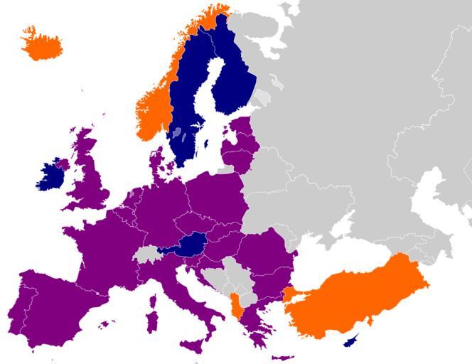 | Keywords: EU and NATO.svg 000080 EU member only FF6600 NATO member only 800080 Member of both 000080 Nur Mitglied der EU FF6600 Nur Mitglied der NATO 800080 Mitglied von beiden 000080 Alleen lid van de EU FF6600 Alleen lid van de NAVO 800080 Lid van beide 000080 státy pouze v EU FF6600 státy pouze v NATO 800080 státy v NATO a EU 000080 członkowie tylko UE FF6600 członkowie tylko NATO 800080 członkowie UE i NATO Own Joebloggsy 2009-03-29 Maps of European Union regional organisations Maps of NATO | ||||