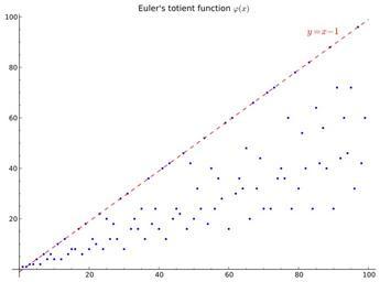 | Keywords: EulerPhi100.svg Sage 6 1 1 Script <pre> P point t euler_phi t for t in srange 1 100 + plot x-1 x 0 100 linestyle -- color red title Euler's totient function \\varphi x + text y x - 1 87 94 color red fontsize 14 P save EulerPhi100 svg transparent True </pre> own User Sverdrup 2014-04-14 Image EulerPhi100 PNG cc-zero Totient function SVG diagrams Order 100 |