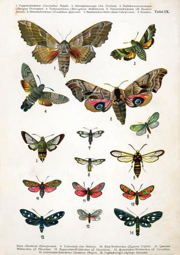 | Keywords: European-butterfly 072-IX.jpg  Smerinthus ocellata par Nemos jpg Laothoe populi par Nemos jpg Proserpinus proserpina par Nemos jpg Macroglossum stellatarum par Nemos jpg Hemaris fuciformis par Nemos jpg Sesia apiformis par Nemos jpg Synanthedon culiciformis par Nemos jpg Bembecia hylaeiformis par Nemos jpg Adscita statices par Nemos jpg Zygaena trifolii par Nemos jpg Zygaena purpuralis par Nemos jpg Zygaena carniolica par Nemos jpg Zygaena coronillae par Nemos jpg Amata phegea par Nemos jpg Aglaope infausta par Nemos jpg Plate IX from Europas bekannteste Schmetterlinge Beschreibung der wichtigsten Arten und Anleitung zur Kenntnis und zum Sammeln der Schmetterlinge und Raupen ca 1895 F Nemos Oestergaard Verlag Berlin 18 chromolithographische Tafeln 160 pp http //hdl handle net/10013/epic 28790 d001 2008-01-21 Dr F Nemos Author died more than 70 years ago - public domain PD-old Europas bekannteste Schmetterlinge |