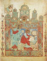 | Keywords: Evangelist John calls Prochorus.jpg en Evangelist John calls Prochorus ru Евангелист Иоанн диктующий П охо у Школа или худ цент Я ославль Ок 1327 г 34 7 × 26 5 см Я ославский исто ико-а хитекту ный и художественный музей заповедник Я ославль Россия Федо овское Евангелие 15718 миниатю а л 2 об http //www icon-art info/masterpiece php lng ru mst_id 1119 Author Ок 1327 г PD-Art Fedorovskoe Gospels Life of Saint John the Evangelist Prochorus | ||||