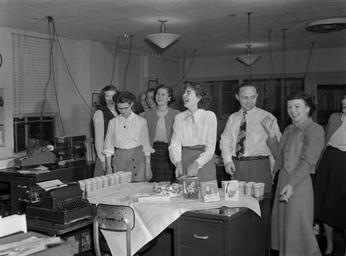| Keywords: library of virginia libraryofvirginia hopewell va hopewellva united mine workers of america unitedmineworkersofamerica chemical industry industrial factory office party officeparty secretary office equipment officeequipment employees blackandwhite groupshot people monochrome indoor black and white Title: Evelyn Harrison, birthday party in V.C. office Date: 1951 Jan. Identifier: Hopewell UMWA Collection 223A Format: 1 negative, safety film Rights Info: No known restrictions on publication. Repository: Library of Virginia, Prints and Photographs, 800 E. Broad St., Richmond, VA, 23219, USA, digitool1.lva.lib.va.us:8881/R Title: Evelyn Harrison, birthday party in V.C. office Date: 1951 Jan. Identifier: Hopewell UMWA Collection 223A Format: 1 negative, safety film Rights Info: No known restrictions on publication. Repository: Library of Virginia, Prints and Photographs, 800 E. Broad St., Richmond, VA, 23219, USA, digitool1.lva.lib.va.us:8881/R |
