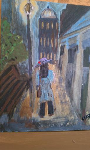 Keywords: Evening Downtown.jpg Acrylics on canvas painting of a girl walking down a sidewalk in the city at dusk 2012-04-29 own Mojaveprincess cc-zero Uploaded with UploadWizard Acrylic on canvas User Mojaveprincess Evening in art