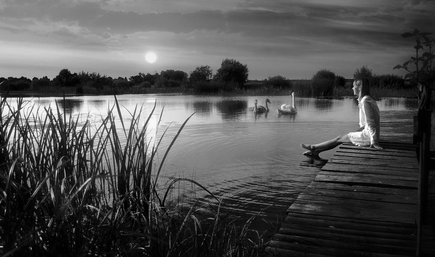 Keywords: evening river sunset lake pond white swan swans bird girl birds feathered neck vacation