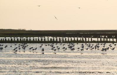 Keywords: evening sky wadden sea watts sea birds gulls sunset afterglow north sea ebb
