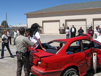 | Keywords: Every 15 Minutes placing victims Alamogordo 2010.jpg en Placing victims at a simulated crash scene at Alamogordo New Mexico High School for Every 15 Minutes a national anti-drunk-driving program own AllenS 2010-04-07 Alamogordo New Mexico Every 15 Minutes Crashed vehicles BMW E36/2 Red coupes |