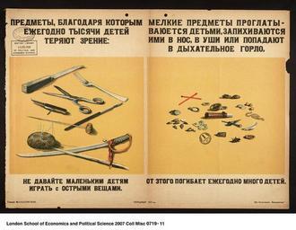 | Keywords: lse library lselibrary sharps safety 1930 russian poster Two panels side by side illustrate some dangerous items which can injure children. The first panel, "Don't let small children play with sharp objects!" shows a sword, pins, a knife, fork, scissors, etc. The second, "Many children die each year from these", shows seeds, buttons, matchstocks, feathers, etc. Printer: Mospoligraf Publisher: Gosmedizdat Place of Production: Moscow Date: 1930 Persistent URL: archives.lse.ac.uk/dserve.exe?dsqServer=lib-4.lse.ac.uk&a... misc 0719/11') Two panels side by side illustrate some dangerous items which can injure children. The first panel, "Don't let small children play with sharp objects!" shows a sword, pins, a knife, fork, scissors, etc. The second, "Many children die each year from these", shows seeds, buttons, matchstocks, feathers, etc. Printer: Mospoligraf Publisher: Gosmedizdat Place of Production: Moscow Date: 1930 Persistent URL: archives.lse.ac.uk/dserve.exe?dsqServer=lib-4.lse.ac.uk&a... misc 0719/11') |