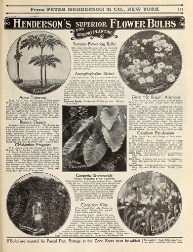 | Keywords: Everything for the garden (15768541294).jpg From PETER HEMDE1S0M KL CO MEW YORK <br> 121 <br> Hendersons superior Flower Bulbs <br> Apios Tuberosa <br> If by Parcel Post add Postage at Zone Rates <br> Weight yi lb per doz Single Bulbs mailed Free <br> An elegant climbing plant growing from 8 to <br> 10 feet high bearing large clusters of brownish- <br> purple sweet-scented flowers in July The tubers <br> may be planted any time in spring the earlier <br> the better and as they are perfectly hardy they <br> require no further attention The vine dies <br> down every winter but starts early in the spring <br> Price 15c each; 1 50 per doz <br> Bessera Elegans <br> Exquisite and free-blooming The flowers are <br> ' borne in graceful umbels of 12 to 20 on stems <br> 1 to 2 feet high and open in succession during <br> fully two months of summer and autumn Color <br> bright vermilion marked with rosy-white For <br> an effective display at least 12 to 25 or more <br> bulbs should be grown in groups in a sunny <br> bed planted about 6 inches apart Price 5c <br> each; 50c per doz ; 4 00 per 100 Mailed Free <br> Chlidanthus Fragrans <br> If by Parcel Post add Postage at Zone Rates <br> Weight 1 x /i lbs per doz Single Bulbs mailed Free <br> A South American bulbous plant that bears <br> very fragrant and pretty bright yellow flowers of <br> open star-like form with long tubes; the flowers <br> are carried on upright clusters on stems 12 to 16 <br> inches high The bulbs may be planted in the <br> garden in spring; they will then flower during <br> the summer and should be taken up in the fall <br> and stored away like Gladiolus bulbs or they <br> may be flowered in pots if desired Price 10c <br> each; 1 00 per doz; 7 50 per 100 <br> Si l <br> Summer-Flowering Bulbs <br> This class includes some of our showiest <br> garden flowers They are of the easiest <br> culture; planted in spring in good garden <br> soil they flower with great certainty <br> during summer and fall The hardy <br> sorts may remain in the ground over <br> winter but the tender sorts are to be <br> taken up after the foliage has ripened <br> in the fall and the bulbs stored away <br> in a dry cool place until planting time <br> the next spring <br> Amorphophallus Rivieri <br> If by Parcel Post add Postage at Zone Rates <br> A showy plant for specimens or groups on <br> a lawn; enormous palm-like leaves 3 to 4 feet <br> in diameter spreading in the shape of an umbrella; <br> the green stem is marbled brown and white; the large <br> red flowers are produced before the leaves appear - It <br> is chiefly grown however for the luxuriant tropical <br> effect of the foliage Plant out in May See cut The <br> larger bulbs produce larger and taller plants the first <br> season Price 50c each; 5 00 per doz Weight 4 oz <br> each <br> Immense Bulbs 1 00 each 10 00 per doz Weight <br> 8 oz each <br> Coope <br> Giant St Brigid Anemone <br> // by Parcel Post add Postage at Zone Rales <br> Weight 1 lb per 100 Single Bulbs and Dozens <br> mailed Free <br> A new race bearing magnificent flowers <br> double semi-double and single 3 to 5 inches <br> across and of the richest as well as the daintiest <br> colors markings blendings etc Scarlet crimson <br> rose pink mauve blue purple yellow cream <br> white tinted variegated striped zoned etc in <br> endless variety The flowers borne on long <br> stems are beautiful when vased the graceful <br> feathery foliage supplying a charming setting <br> The tubers planted in the spring will flower during <br> the summer in sheltered locations See cut <br> Mixed Colors 5c each; 50c doz ; 3 00 per 100 <br> Caladium Esculentum <br> If by Parcel Post add Postage at Zone Rates <br> Weights given <br> Elephant's Ear Grand tropical-looking <br> plant A favorite for specimens on the lawn <br> or for bordering large sub-tropical groups In <br> deep rich soil if freely watered they produce <br> enormous leaves frequently 4 feet long by 3 feet <br> wide; height 4 to 5 feet See cut <br> Extra Size 12 inches and over in circumference <br> Price 25c each; 2 50 per doz Weight 2 lbs <br> _ each <br> First Size 9 inches and over in circumference <br> Price 15c each; 1 50 per doz Weight 1 lb <br> each <br> Second Size 6 inches and over in circumference <br> Price 10c each; 1 00 per doz Weight y 2 lb <br> each <br> eria Drummondii <br> TEXAS EVENING STAR FLOWER <br> // by Parcel Post add Postage at Zone Rates Weight <br> 4 lbs per 100 Single Bulbs and Dozens mailed Free <br> Planted out in the garden in the spring a clump <br> of 12 to 25 or more 4 to 6 inches apart will <br> bloom successively from May to Septem- <br> ber The flowers are star-shaped with <br> long tubes pure white and exquisitely <br> fragrant with the odor of Primroses <br> Price 6c each; 60c per doz ; 4 50 <br> per 100 <br> Cinnamon Vine <br> If by Parcel Post add Postage ax <br> Zone Rales Weight 2 lbs per doz <br> Single Bulbs mailed Free <br> A beautiful hardy climber for_ any- <br> thing on which the vines can twine; it <br> grows from 15 to 30 feet high and when <br> established the vines attain a much greater <br> length The leaves are green thick and <br> glossy always clean healthy and free from <br> insects The white flowers while insignificant <br> emit a delightful cinnamon-like perfume The roots <br> remain in the ground for years increasing in size and vigor <br> but the vine dies down every winter See cut Price extra <br> large 2-year-old roots 12c each; 1 25 per doz ; 10 00 per 100 <br> If Bulbs are wanted by Parcel Post Postage at the Zone Rates must be added <br> The weights 1 <br> are given J <br> Single Bulbs mailed free <br> excepting otherwise noted 43874913 149634 78295 Page 121 Text http //www biodiversitylibrary org/page/43874913 c1915 10 5962/bhl title 78295 Henry G Gilbert Nursery and Seed Trade Catalog Collection ; Peter Henderson Co NameFound Amorphophallus NameConfirmed Amorphophallus Blume ex Decne EOLID 29462 NameFound A