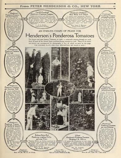 | Keywords: Everything for the garden (15770871893).jpg SEE PAGES 6 AND 7 <br> Henderson s <br> Ponderosa Tomato <br> for Quality Quantity <br> I enclose a snap- <br> shot of Henderson's <br> Ponderosa Toma- <br> toes taken in my gar- <br> den five miles from <br> St Louis It does not <br> give you a true idea <br> of the quantity we <br> had on the vines <br> The quality was <br> wonderful tp~ \f- / ;l <br> W E Fleshman V sJ ~P <br> R D No 2 <br> Box 12 <br> Louis <br> Redman Raises Red <br> Ponderosas weighing 2 1 /4 lbs <br> and wins Prizes <br> Henderson s <br> Ponderosa Tomatoes <br> a Paying Proposition <br> Last season I sold <br> 'over 46 00 worth of <br> Ponderosa Tomatoes <br> from rows of plants <br> totalling 120 feet <br> Two large families <br> also used all they <br> could during the sum- <br> mer and then I can- <br> ned five gallons <br> They were large <br> meaty beefsteak- <br> like Tomatoes <br> W A Jones <br> Uvalde <br> Tex <br> enderson s <br> onderosa Tomato <br> Plant held 2 1 Fruits <br> The Ponderosa <br> Tomato plant shown <br> in the picture held <br> 21 Tomatoes at the <br> time the photograph <br> was taken 11 of <br> these grew to an im- <br> mense size and all <br> ripened through <br> The quality was ex- <br> cell en t being <br> rich meaty and <br> solid E F <br> St A PL ETON <br> Memphis <br> Tenn <br> Henderson's <br> Ponderosa Tomatoes <br> 14 feet from Ground <br> Your Ponderosa <br> Tomato is certainly <br> great I send you <br> photo of my plants <br> Some grew 18 feet <br> high and had fruit on <br> them 14 feet from <br> the ground Many of <br> the fruits were of <br> monstrous size yet <br> of first quality One <br> Tomato makes a <br> meal Geo F <br> Farnsworth <br> Geneva <br> N Y <br> M <br> Henderson's <br> FVed Ponderosa <br> Price 10c pkt 50c oz <br> Lucius Miller an Indian gardener in tf <br> my employ raised some prize Ponderosa <br> Tomatoes this year some of them <br> weighing 2J4 pounds and measuring <br> 16J4 inches around <br> Mrs F B Joyce <br> Mt Rainier Wash ___ <br> Special Offer <br> One packet each of <br> \ 75 'A lb Red and Golden Ponderosa for 25c <br> Henderson's Ponderosa Tomatoes <br> Weighing 3 lb 10V2 oz <br> I prefer the Ponderosa to any other <br> Tomato I raised some in my home <br> garden last season weighing 3 pounds <br> 10H ounces I think this must be the <br> record y <br> Ed B Lewis xr <br> Bangor Ga _ -g u <br> – v Henderson <br> – ” ~~ Golden Pone- <br> Price 20c pkt 3 pkts 50c <br> Henderson s <br> Ponderosa Tomatoes <br> are very Delicious <br> I am mailing you <br> a photo of both <br> the Red and Golden <br> Ponderosa which I <br> grew in my backyard <br> at Los Angeles They <br> were a great wonder <br> to the people here <br> on account of their <br> 7pkts 1 00 43874853 149634 78295 Page 61 Text http //www biodiversitylibrary org/page/43874853 c1915 10 5962/bhl title 78295 Henry G Gilbert Nursery and Seed Trade Catalog Collection ; Peter Henderson Co NameFound Lucius NameConfirmed Lucius EOLID 4618736 NameBankID 177501 NameFound Ponderosa Biodiversity Heritage Library Everything for the garden 1915 Garden Stories Books Bulbs Plants Catalogs Equipment and supplies Flowers Gardening Lawn mowers Seeds U S Department of Agriculture National Agricultural Library bhl page 43874853 dc identifier http //biodiversitylibrary org/page/43874853 bhlGardenStories BHLinbloom bulbs plants u s department of agriculture national agricultural library bhlgardenstories bhlinbloom Information field Flickr posted date ISOdate 2015-01-28 Check categories 2015 August 25 CC-BY-2 0 BioDivLibrary https //flickr com/photos/61021753 N02/15770871893 2015-08-25 02 53 14 cc-by-2 0 PD-old-70-1923 Everything for the garden 1915 Photos uploaded from Flickr by Fæ using a script |