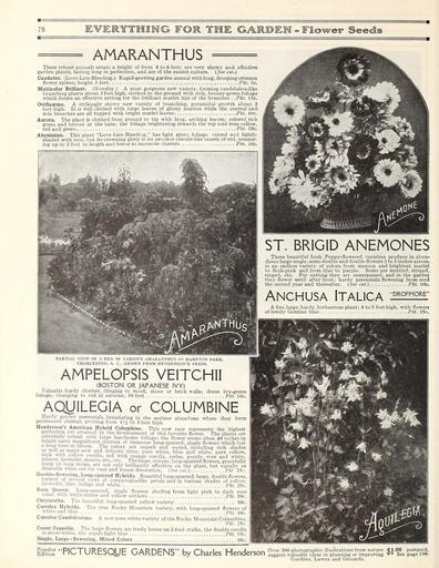 | Keywords: Everything for the garden (15770901313).jpg 78 <br> ;VBIRYT5HIHM Q FOR TIE GARDEH - FEowes Seed; <br> AMARANTHUS ” <br> These robust annuals attain a height of from 4 to 6 feet; are very showy and effective <br> garden plants lasting long in perfection and are of the easiest culture See cut <br> Caudatus Love-Lies-Bleeding Rapid-growing garden annual with long drooping crimson <br> flower spikes; height 3 feet Pkt 5c <br> Multicolor Brilliant Novelty A most gorgeous new variety forming candelabra-like <br> branching plants about 3 feet high clothed to the ground with rich bronzy-green foliage <br> which forms an effective setting for the brilliant scarlet tips of the branches Pkt 15c <br> Oriflamme A strikingly showy new variety of branching pyramidal growth about 5 <br> feet high It is well clothed with large leaves of glossy maroon while the central and <br> side branches are all topped with bright scarlet leaves Pkt 10c <br> Aurora The plant is clothed from ground to tip with long arching leaves; colored rich <br> green and bronze at the base; the foliage brightening towards the top into rose-yellow <br> red and green Pkt 10c <br> Abyssinian This giant Love-Lies-Bleeding has light green foliage veined and lightly <br> shaded with rose but its crowning glory is its pendent chenile-like tassels of red measur- <br> ing up to 2 feet in length and borne in immense clusters Pkt 10c <br> ST BRIGID ANEMONES <br> These beautiful Irish Poppy-flowered varieties produce in abun- <br> dance large single semi-double and double flowers 3 to 5 inches across <br> in an endless variety of colors from maroon and brightest scarlet <br> to flesh-pink and from lilac to purple Some are mottled striped <br> ringed etc For cutting they are unsurpassed and in the garden <br> they flower until after frost; hardy perennials flowering from seed <br> the second year and thereafter See cut Pkt 10c <br> Anchusa Italica dropmore <br> BOSTON OR JAPANESE IVY <br> Valuable hardy climber clinging to wood stone or brick walls; dense ivy-green <br> foliage changing to red in autumn; 30 feet Pkt 10c <br> AQUILEGIA or COLUMBINE <br> Hardy garden perennials luxuriating in the moister situations <br> permanent clumps growing from 114 to 3 feet high <br> Henderson's American Hybrid Columbine This new race represents the highest <br> perfection yet attained m the development of this favorite flower The plants are <br> extremely robust with large handsome foliage; the flower stems often 40 inches in <br> Height carry magnificent clusters of immense long-spurred single flowers which last <br> a long time in bloom The colors are superb and varied including rich shades <br> as well as many new and delicate tints; pure white blue and white pure yellow <br> pink with yellow corolla red with orange corolla cerise purple rose and white <br> salmon lavender mauve etc etc The large unique long-spurred flowers gracefully <br> hung on long stems are not only brilliantly effective on the plant but equally as <br> desirable when cut for vase and house decoration See cut Pkt- 25c <br> Double-flowering Long-spurred Hybrids Beautiful long-spurred large double flowers <br> ormed oi several rows of cornucopia-like petals and in various shades of yellow <br> lavender blue indigo and white pkt 25c <br> Rose Queen Long-spurred single flowers shading from light pink to dark rose <br> color with white center and yellow anthers Pkt 10c <br> Chrysantha The beautiful long-spurred yellow variety 10c <br> Ccerulea Hybrida The true Rocky Mountain variety with long-spurred flowers of <br> white and blue – p t jq c <br> Caerulea Candidissima A new pure white variety of the Rocky Mountain Columbine <br> Pkt 25c <br> Count Zeppelin The large flowers are freely borne on 2-foot stalks the double corolla <br> is snow-white the sepals light blue Pkt 1 5c <br> Single Large -flowering Mixed Colors 10i <br> Popular <br> Edition <br> irge - flowering Mixed Colors <br> 'PICTURESQUE GARDENS by Charles Henderson ° J£S £ i £E fl KWfc <br> Gardens Lawns and Grounds 43874870 149634 78295 Page 78 Text http //www biodiversitylibrary org/page/43874870 c1915 10 5962/bhl title 78295 Henry G Gilbert Nursery and Seed Trade Catalog Collection ; Peter Henderson Co NameFound Amaranthus NameConfirmed Amaranthus EOLID 37601 NameBankID 2646887 NameFound Anchusa NameConfirmed Anchusa EOLID 70954 NameBankID 2654558 NameFound Aquilegia NameConfirmed Aquilegia EOLID 11205314 NameBankID 2645540 NameFound Caerulea NameConfirmed Caerulea EOLID 33504 NameBankID 3001222 NameFound Candidissima NameConfirmed Candidissima NameBankID 4102668 NameFound Caudatus NameFound Hybrida NameConfirmed Hybrida NameBankID 5327990 Biodiversity Heritage Library Everything for the garden 1915 Garden Stories Books Bulbs Plants Catalogs Equipment and supplies Flowers Gardening Lawn mowers Seeds U S Department of Agriculture National Agricultural Library bhl page 43874870 dc identifier http //biodiversitylibrary org/page/43874870 bhlGardenStories BHLinbloom bulbs plants u s department of agriculture national agricultural library bhlgardenstories bhlinbloom Information field Flickr posted date ISOdate 2015-01-28 Check categories 2015 August 25 CC-BY-2 0 BioDivLibrary https //flickr com/photos/61021753 N02/15770901313 2015-08-25 03 01 45 cc-by-2 0 PD-old-70-1923 Everything for the garden 1915 Photos uploaded from Flickr by Fæ using a script |