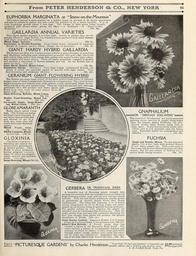 Keywords: Everything for the garden (16203315608).jpg Ff DKim FETEIR HEMDEIRSOM EL CO MEW Â¥OM <br> 93 <br> EUPHORBIA MARGINATA or Snow-on-the-Mountain <br> This native annual is quite popular as a garden plant on account of its showy appearance <br> and ease of culture in almost any soil ” even the poorest ” if in a sunny location It is of <br> rank branching growth about 2 feet high The foliage of light green being broadly <br> margined with silvery-white giving the effect ” -in miniature ” of Snow-on-the- <br> Mountain Pkt 10c <br> GAILLAKDIA ANNUAL VARIETIES <br> Very showy garden annuals 1 to 2 feet high Grown in masses they are es- <br> pecially effective; large flowers 2 to 3 inches across produced from early summer <br> until frost; unrivaled for cutting <br> Mixed Single Varieties Pkt 5c <br> Lorenziana or Double-flowering Large round heads composed of numerous <br> flowers of crimson garnet lemon orange etc in miniature Pkt 5c <br> GIANT HARDY HYBRID GAILLARDIA <br> The flowers are often 4 to 5 inches across colored in great diversity of variations <br> and blendings including such combinations as scarlet with gold edge blood-red <br> with yellow edge yellow with orange disk golden with scarlet border pure yellow <br> fiery-crimson and many others These are hardy perennials compact in growth <br> and produce a succession of flowers summer and fall As cut flowers last in <br> water for days See cut <br> Giant Hardy Hybrid Mixed Colors Pkt 10c <br> Grandiflora Sibylla Novelty Very large bright carmine-red flowers the <br> petals of which are narrowly tipped or pointed with light yellow Very <br> free-blooming and strikingly effective Pkt 25c <br> GERANIUM GIANT FLOWERING HYBRID <br> The flowers are extra large round of the most perfect form borne in splendid <br> trusses some of them forming balls 16 inches in circumference The colors include <br> shades of scarlet and crimson rose pink salmon cream veined pink blush snowy- <br> white and all of the new auriole types These all stand the hot sun and although <br> perennials they will produce nice bushy plants and <br> flower from seeds sown the same season; 12 to 18 <br> Inches high See cut <br> Giant-flowering Hybrids Mixed Colors <br> Pkt 15c <br> Double Giant-flowering Mixed Col- <br> ors Pkt 25c <br> Ivy-leaved Single Large-flower- <br> ing Mixed Colors Pkt 25c <br> GLOBE AMARANTH <br> Bushy plants about 2 feet <br> high The flowers are useful <br> for dried winter bouquets If <br> cut before they are fully ripe <br> and allowed to dry in a <br> dark airy room they will <br> retain their color the whole <br> season <br> Mixed Purple white <br> etc Pkt 5c <br> NANA Compacta Mixed <br> 4 foot high Pkt 5c <br> GLOXINIA <br> Charming summer- <br> blooming pot plants for <br> conservatory green-house <br> or window garden They <br> flower in great profusion <br> having gorgeous colors <br> many of which are magnifi- <br> cently spotted and mottled <br> 1 foot See cut <br> Large-flowering Mixed Pfei 25c <br> GNAPHALIUM <br> -OR SIBEKIAN EDELWEISS <br> This beautiful Everlasting is a hardy perennial <br> growing about one foot in height being larger <br> than the famous Alpine Edelweiss the star- <br> shaped woolly white flowers being fully as <br> large again It also thrives better under culti- <br> vation and in low latitudes than the Alpine <br> type Especially suited for rock gardens and <br> hillsides Pkt 15c <br> FUCHSIA <br> Single and Double Mixed Tender perennial <br> plants 2 to 4 feet high with pendent flowers <br> of red white purple etc Seed sown early in <br> the house will produce flowering plants the first <br> season; fine for pot culture or bedded out in <br> partial shade during summer Pkt 25c <br> GERBERA OR transvaal daisy <br> A beautiful race of flowering plants brought into <br> prominence recently with the introduction of an improved <br> large-flowering scarlet type and the new various-colored <br> hybrids They are half hardy perennials usually grown <br> as greenhouse or window plants where they flower <br> continuously The Daisy-like blossoms 3 to 4 inches <br> across being borne on 12 to 18 inch stems are unsur- <br> passed as cut flowers being of splendid lasting substance <br> For garden culture in cold climates the plants are <br> wintered over in cold frames like Pansies etc They are <br> easily grown from seed and will commence flowering the <br> first year though older plants will produce the greater <br> abundance of bloom See cut <br> Giant Scarlet Gerbera Immense flowers 5 to 6 inches <br> across on 2 to 3-foot stems Color intense scarlet Pkt 2 5c <br> Adnet's New Hybrids A French strain that has <br> created a furore in the European floral world The <br> colors include a galaxy of incomparable delicacy and <br> richness in which an infinity of tints from pure white <br> through yellow orange salmon rose cerise and ruby- <br> red to violet are represented Sometimes the color- <br> ing of the disk differs from that of the rays Pkt 35c <br> Popular <br> Edition <br> PICTURESQUE GARDENS by Charles Henderson J £ 2 tf V B'g£ –  <br> A B FARQUHAR York Pa <br> t 1 00 postpaid <br> «P1 See page 199 43874885 149634 78295 Page 93 Text http //www biodiversitylibrary org/page/43874885 c1915 10 5962/bhl title 78295 Henry G Gilbert Nursery and Seed Trade Catalog Collection ; Peter Henderson Co NameFound Compacta NameConfirmed Compacta EOLID 10934908 NameBankID 2627020 NameFound Euphorbia marginata NameConfirmed Euphorbia marginata EOLID 1144444 NameBankID 2651828 NameFound Gaillardia NameConfirmed Gaillardia Foug EOLID 38325 NameFound Gerbera NameConfirmed Gerbera EOLID 60453 NameBankID 2676014 NameFound Gloxinia NameConfirmed Gloxinia L'Her EOLID 72184 NameFound Gnaphalium NameConfirmed Gnaphalium EOLID 59452 NameBankID 2658074 NameFound Grandiflora NameFound Lorenziana NameConfirmed Lorenziana NameBankID 5328378 NameFound Sibylla NameConfirmed Sibylla EOLID 10138 NameBankID 4342936 Biodiversi