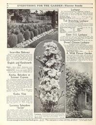 | Keywords: Everything for the garden (16203320988).jpg 96 <br> EVERYTfOHG FOR THE GARDEM - Fl w s Seeds <br> Incarvillea Delavayi <br> Beautiful new garden plant with long flexible <br> branches It forms large fleshy roots the first <br> year which should remain in the ground the next <br> season and thereafter they throw up strong <br> flower stalks 3 feet high bearing large tubular <br> flowers of rosy-carmine spotted yellow; throat <br> brown Pkt 15c <br> English and Kenilworth <br> Ivy <br> English Hedera Helix Well-known hardy <br> vine for moist shaded positions; waxy-green <br> leaves; 40 feet Pkt 10c <br> Kenilworth Ivy Hardy little climber clings to <br> walls etc and a valuable trailing plant for <br> hanging baskets vases etc ; 3 to 6feet P 10c <br> Kochia Belvidere or <br> Summer Cypress <br> An old-fashioned popular annual sometimes <br> known as Belvidere Mock Cypress Mexican Fire <br> Plant etc It is easily grown from seed ” forming <br> oval bushes 2 to 2 4 feet high densely clothed <br> with small feathery light green foliage deepening <br> in color as the summer advances until the whole <br> plant assumes a fiery-crimson hue The small <br> numerous flowers borne in the fall are also_ of a <br> bright red color An attractive plant at all times <br> either in garden beds or in pots <br> Placed at intervals in beds of white Sweet <br> Alyssum or among Dusty Millers the effect is <br> very fine See cut Pkt 10c <br> Larkspur <br> For Hardy Perennial Larkspurs or Delphiniums see Page 90 <br> Popular garden annuals The spikes of splendid flowers are <br> of varied shades of red blue white etc They are of easy <br> culture thriving in almost any soil ” but a sunny situation <br> suits them best <br> Tall Rocket Mixed 2J-2 feet Per Oz 25c; Pkt 5c <br> Dwarf Rocket Mixed 1 foot 25c; 5c <br> Collection of Dwarf Rocket 6 colors 25c; 12 colors 40c <br> Tall Branching Larkspur <br> Consolida Candelabra fl pi <br> This splendid class grows 2 to 3 feet high and bears flowers <br> on long stems rendering them of exceptional value for cutting <br> purposes They are of long-continued bloom keeping up a bright <br> display until cut down by frost See cut <br> Tall Branching Mixed Colors Per Oz 30c; Pkt 10c <br> White Pkt 10c Dark Blue 10c <br> Carmine 10c Rose 10c <br> Light Blue 10c Striped 10c <br> Rosy-scarlet A bright beautiful color 10c <br> Collection of 6 separate colors 50c <br> Giant fiow ' Larkspur <br> A much improved type of the Dwarf Rocket class The <br> splendid flowers are very large very double and of various <br> beautiful colors shades and markings borne on spikes like <br> immense Hyacinths; height 15 to 18 inches <br> Giant Hyacinth-flowered Mixed Colors Per Oz 30c; Pkt 10c <br> Dwarf Chinese Larkspur <br> Delphinium Chinese pumilum <br> These are exceedingly pretty garden plants of branch- <br> ing compact habit not over a foot high when in bloom <br> Seed sown in the spring will produce flowering plants <br> by July and from that time until frost they are cov- <br> ered with the loveliest blue or white flowers elicit- <br> ing general admiration <br> Dwarf Chinese Mixed Colors Pkt 10c <br> A Wild Flower Garden <br> of great and interesting variety may be made in <br> any suitable out of the way place by sowing broad- <br> cast and raking in Henderson's Special Mixed <br> Wild Garden Flower Seeds Sow at the rate of 1 <br> oz per 100 square feet mixed with sand for even- <br> ness of distribution Price 15c per oz ; 50c per <br> H\b ; SI 50 per lb postpaid <br> Kudzu Vine <br> A twining vine of remarkably rapid growth <br> attaining a length of 40 to 50 feet in one season <br> from established roots; hardy though the vine <br> dies down every winter in the North Foliage <br> large and lobed; purple Pea-shaped flowers in <br> clusters borne late in the season A fine vine <br> for arbors verandas etc Easily grown from <br> seed See cut Pkt 10c <br> Lavatera Splendens <br> Sunset <br> A beautiful robust garden annual of easy <br> culture and thriving in almost any soil in a sunny <br> location The plants form branching compact <br> bushes 2 to 2 feet in height and bearing abun- <br> dantly throughout summer and fall ” large <br> shallow or bowl-formed flowers of charmingly <br> bright rich rose-pink A great improvement over <br> all other varieties; most effective in beds and as a <br> cut flower it is charming and lasts well Pkt 10c <br> I antana Rapid-growing constant-blooming tender <br> 1_ AI Hell Id perennial plants for pot culture in the win- <br> ter or garden decoration in the summer; clusters of <br> flowers orange white pink etc ; 2 to 3 feet <br> Mixed Colors Pkt 10c <br> It is not enough to know that Seeds grow £ £ The vital point is what will they produce H <br> their Superior 43874888 149634 78295 Page 96 Text http //www biodiversitylibrary org/page/43874888 c1915 10 5962/bhl title 78295 Henry G Gilbert Nursery and Seed Trade Catalog Collection ; Peter Henderson Co NameFound Alyssum NameConfirmed Alyssum L EOLID 39058 NameFound Consolida NameConfirmed Consolida Gray EOLID 60670 NameFound Hedera NameConfirmed Hedera EOLID 107358 NameBankID 2652711 NameFound Incarvillea NameConfirmed Incarvillea EOLID 2876289 NameBankID 1791917 NameFound Kochia NameConfirmed Kochia Roth EOLID 61798 NameFound Lavatera NameConfirmed Lavatera L EOLID 71639 NameFound Splendens NameConfirmed SPLENDENS NameBankID 5329910 Biodiversity Heritage Library Everything for the garden 1915 Garden Stories Books Bulbs Plants Catalogs Equipment and supplies Flowers Gardening Lawn mowers Seeds U S Department of Agriculture National Agricultural Library bhl page 43874888 dc identifier http //biodiversitylibrary org/page/43874888 bhlGardenStories BHLinbloom bulbs plants u s department of agriculture national agricultural library bhlgardenstories bhlinbloom Information field Flickr posted date ISOdate 2015-01-28 Check categories 2015 August 25 CC-BY-2 0 BioDivLibrary https //flickr com/phot