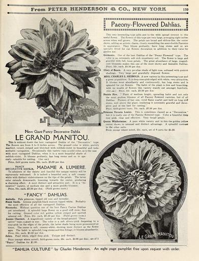 | Keywords: Everything for the garden (16203470208).jpg Fs-©sa PETEH 1ENDERSOH BL CO NEW YORli <br> 159 <br> £ <br> New Giant Fancy Decorative Dahlia <br> LE GRAND MANITOU <br> This is without doubt the best variegated Dahlia of the Decorative type <br> The flowers are from 5 to 6 inches across The ground color is white prettily <br> marbled veined striped and blotched with reddish-violet in beautiful and inde- <br> scribable variegation Occasionally this variety runs a solid color as is the case <br> with most variegated Dahlias when it is a most beautiful shade of <br> reddish-violet It blooms profusely has long stems and so is spe- <br> cially valuable for cutting See cut <br> Price field grown roots 50c each 5 00 per doz <br> SISISISllSIlSllSSlSlfflfflSSISISJSIBISSISlSlSlSISISlSllSHSlSlfflSISSlSSlSllSIS <br> 1 Paeony- Flowered Dahlias S <br> II II S S S S IS S SI SI II SI 19 SI SI H SI SI SI S II SI II S SI II II SI H II II II SI ffl II IS M CS II <br> This very interesting type adds zest to the wide spread interest in this <br> useful flower The flowers of this type are very large averaging eight inches <br> across when well grown The petals are broad and ribbon-like the center <br> shows adding an artistic charm closely resembling the semi-double Paeonies <br> in appearance They bloom profusely have long stems and so are <br> specially fitted for cut flowers decoration in addition to their value for <br> garden use <br> Germania One of the best Dahlias of the Peony Flowered type The <br> color is an extremely soft rich strawberry red The flower is large and <br> graceful with full loose petals The great abundance of large magnifi- <br> cent blossoms makes this one of the most showy and desirable Dahlias <br> Price 35c each S3 50 per doz <br> Glory of Baarn A very peculiar shade of light rose softened with pinkish <br> shadings Very large and gracefully disposed flowers <br> MRS CHARLES L SEYBOLD A new variety in this interesting type and <br> a great acquisition It is deep rose-pink edged with white very attractive <br> It blooms most abundantly and continuously has long stems and is <br> splendid for cut flowers The habit of the plant is free and branching <br> with its wealth of flowers this variety stands out amongst hundreds <br> See cut Price 35c each 3 50 per doz <br> Prairie Fire Plant of medium height spreading habit and not only <br> the most profuse bloomer of all Paeony flowered varieties but of all <br> Dahlias Flowers of fair size vivid flame scarlet and held on long stiff <br> stems well above the plant rendering it extremely graceful and decor- <br> ative and of the best for cutting <br> Price field-grown roots 35c each 3 50 per doz <br> Princess Victoria Louise This is sometimes classed as a Decorative <br> but it is really one of the Paeony flowered type Color a beautiful deep <br> rose pink clear and effective Very broad petals <br> Queen Whilhelmina A pure white variety and in this the golden yellow <br> center shows to unusual and distinct advantage A splendid contrast <br> to the other sorts <br> Price except where noted 25c each set of 6 sorts for 1 50 <br> MADAME A LUMIERE <br> FANCY <br> DECORATIVE DAHLIA <br> To admirers of the dainty and fanciful this unique variety will be <br> rapturously welcomed It is indeed a beautiful sort a soft creamy <br> white with distinct violet-crimson on the tips of the petals The latter <br> color extends downwards lessening towards the center producing <br> a charming effect A most distinct and attractive sort It is a de- <br> corative variety of medium size and a most prolific- bloomer <br> Price 35c each 3 50 per doz Field grown roots <br> FANCY DAHLIAS <br> Probably <br> Arabella Pale primrose tipped old rose and lavender <br> Frank Smith Intense purplish-black maroon tipped white <br> the most effective of all the variegated Dahlias <br> Fireworks Without question one of the best Fancy Cactus Dahlias <br> yet introduced A splendid large flower on a good stiff stem; fine <br> for cutting Ground color rick golden yellow striped and spotted <br> oriental red Price 35c each 3 50 per doz Field grown roots <br> Jeanne Charmet A magnificent variety of the broad-petaled Deco- <br> rative type; a giant in size The color is a soft silvery-pink deepening to a <br> rosy-pink on the edges of the petals the latter shade being more pronounced at <br> times The center is soft creamy-white showing more distinct as the flower <br> ages The habit is splendid long stems and fine foliage; it blooms abundantly <br> Price 35c each 3 50 per doz <br> Zebra Pearl white edged deep pink Unique and distinct <br> Price except where noted field-grown roots 20c each 2 00 per doz ; set of 5 <br> Fancy Dahlias for 1 00 <br> legBiv an ; <br> DAHLIA CULTUKE by Charles Henderson An eight page pamphlet free upon request with order 43874951 149634 78295 Page 159 Text http //www biodiversitylibrary org/page/43874951 c1915 10 5962/bhl title 78295 Henry G Gilbert Nursery and Seed Trade Catalog Collection ; Peter Henderson Co NameFound Arabella NameConfirmed Arabella EOLID 52830 NameBankID 2551431 NameFound Victoria NameConfirmed Victoria EOLID 34123 NameBankID 897688 NameFound Whilhelmina Biodiversity Heritage Library Everything for the garden 1915 Garden Stories Books Bulbs Plants Catalogs Equipment and supplies Flowers Gardening Lawn mowers Seeds U S Department of Agriculture National Agricultural Library bhl page 43874951 dc identifier http //biodiversitylibrary org/page/43874951 bhlGardenStories BHLinbloom bulbs plants u s department of agriculture national agricultural library bhlgardenstories bhlinbloom Information field Flickr posted date ISOdate 2015-01-28 Check categories 2015 August 25 CC-BY-2 0 BioDivLibrary https //flickr com/photos/61021753 N02/16203470208 2015-08-25 03 02 08 cc-by-2 0 PD-old-70-1923 Everything for the garden 1915 Photos uploaded from Flickr by Fæ using a script |