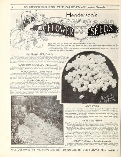 | Keywords: Everything for the garden (16203513240).jpg 76 <br> 'ERYTSOHQ <br> iiiiimii <br> Henderson's <br> ANNUALS attain full growth from seed flower and die in one year <br> BIENNIALS grow from seed one year bloom and 'die the next though some varieties bloom the first <br> season when sown early <br> PERENNIALS last for several years blooming annually after the first season though some varieties will <br> bloom the first season if sown early <br> ACHILLEA THE PEARL <br> A greatly improved variety of this old hardy garden favorite 4 Ptarmica fl pi <br> The Pearl produces much larger and more fully double pure white flowers which are <br> borne in large clusters on long stems It grows about 2 feet high and is literally <br> covered with these snowy blossoms from spring until frost Splendid cut flower <br> for vases Although a perennial it will flower freely the first season if the seed is <br> sown early Pkt 10c <br> ACONITUM NAPELLUS Monkshood <br> Handsome hardy herbaceous plant throwing bold spikes of dark blue <br> flowers in summer Effective in hardy flower borders shrubberies etc ; <br> height 3 to 4 feet Pkt 10c <br> ACROCLINIUM Double Mixed <br> Free summer-flowering annual plants for garden decoration; the flowers <br> dry as Everlastings for winter bouquets; Acrocliniums are also grown <br> as pot plants for market in European cities ” in full bloom the plants <br> are showy and effective ” -and will stand a lot of abuse on account of <br> the lasting quality of the flowers; 1 foot Pkt 5c <br> ADLUMIA CIRRHOSA <br> Hardy biennial climber known as Mountain Fringe Fumatory <br> and Allegheny Vine ; feathery foliage rose-colored flowers; it grows <br> freely from seed which should be sown in the spring near a trellis <br> or arbor The plants will then flower freely the following season without <br> further care; 15 feet Pkt 10c <br> A COMPLETE FLOWER GARDEN FOR 1 00 <br> Either for one season or permanent may be had with Henderson's Collec- <br> tions of Annual or Hardy Perennial Flower Seeds Set of climbers extra <br> 50c All are offered on page 75 <br> CARPET OF SNOW <br> AGERATUM <br> Dwarf compact-growing plants 6 to 8 inches high flowering freely through- <br> out the season from spring-sown seed; splendid for bedding edgings or pots <br> Snowball Large clusters of pure white flowers Pkt 10c <br> Blue Perfection Large heads of deep amethyst-blue flowers; plant very even in <br> growth about 8 inches high Pkt 10c <br> Blue Star A tiny and compact variety only 4 to 5 inches high densely <br> covered with light blue flowers Pkt 10c <br> SWEET ALYSSUM <br> Lilac Queen Novelty A distinct new annual variety with pure lilac colored <br> flowers The plants are of dwarf compact growth and are equally as useful for <br> carpet bedding and edgings as the dwarf white varieties Pkt 15c <br> Carpet of Snow This new variety is pure white and grows only 2 to <br> 3 inches high and flowers profusely; in fact it is a perfect carpet of snow <br> throughout the season We have counted as many as 300 heads of pure <br> white flowers open on one plant at one time For edging and beddings this <br> is a very satisfactory little annual See cut Per oz 50c Pkt 10c <br> Tom Thumb or Little Gem Sweet Alyssum One of the finest for edgings <br> and low beds; 34 foot Per oz 30c Pkt 5c <br> Maritimum The well-known Sweet Alyssum; white flowers borne profusely; <br> M foot Per oz 25c Pkt 5c <br> HARDY ALYSSUM Saxatile Compacta <br> A beautiful dwarf hardy perennial for spring beds or edging a flower border <br> The flowers are produced in large clusters and are of a deep pure yellow; <br> foot Per 1 000 seeds 25c Pkt 10c <br> FULL CULTURAL INSTRUCTIONS ARE PRINTED ON ALL OF OUR FLOWER SEED PACKETS 43874868 149634 78295 Page 76 Text http //www biodiversitylibrary org/page/43874868 c1915 10 5962/bhl title 78295 Henry G Gilbert Nursery and Seed Trade Catalog Collection ; Peter Henderson Co NameFound ACHILLEA NameConfirmed Achillea EOLID 36945 NameBankID 2657276 NameFound Aconitum napellus NameConfirmed Aconitum napellus EOLID 596409 NameBankID 2645295 NameFound Acroclinium NameConfirmed Acroclinium EOLID 6262186 NameBankID 1674219 NameFound Acroclinium NameConfirmed Acroclinium EOLID 6262186 NameBankID 4850542 NameFound Adlumia cirrhosa NameConfirmed Adlumia cirrhosa NameBankID 5820744 NameFound Ageratum NameConfirmed Ageratum L EOLID 59467 NameFound Alyssum NameConfirmed Alyssum L EOLID 39058 NameFound Compacta NameConfirmed Compacta EOLID 10934908 NameBankID 2627020 NameFound Lilac NameConfirmed Lilac P Miller 1754 NameFound Maritimum NameFound Ptarmica NameConfirmed Ptarmica EOLID 5122701 NameBankID 4906367 Biodiversity Heritage Library Everything for the garden 1915 Garden Stories Books Bulbs Plants Catalogs Equipment and supplies Flowers Gardening Lawn mowers Seeds U S Department of Agriculture National Agricultural Library bhl page 43874868 dc identifier http //biodiversitylibrary org/page/43874868 bhlGardenStories BHLinbloom bulbs plants u s department of agriculture national agricultural library bhlgardenstories bhlinbloom Information field Flickr posted date ISOdate 2015-01-28 Check categories 2015 August 25 CC-BY-2 0 BioDivLibrary https //flickr com/photos/61021753 N02/16203513240 2015-08-25 02 52 40 cc-by-2 0 PD-old-70-1923 Everything for the garden 1915 Photos uploaded from Flickr by Fæ using a script |