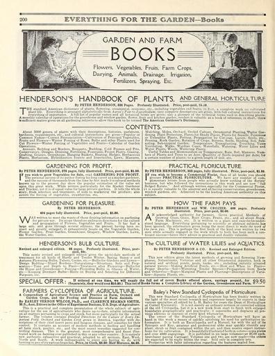 | Keywords: Everything for the garden (16203541488).jpg s of Varie- <br> ties Aquaria Plants etc <br> CpCf I A j / pppD If ordered at one time we will supply the full set of seven Books offered above carriage prepaid for tQ C \ <br> J1 L V-'IAAl Wl 1 1_1\ Separately they would cost 10 60 This set of Books forms a Complete Library of the Garden Greenhouse and Farm P -' -/ v <br> FARMERS CYCLOPEDIA OF AGRICULTURE <br> A Compendium of Agricultural Science and Practice on Farm Orchard and <br> Garden Crops and the Feeding and Diseases of Farm Animals <br> By EARLEY VERNON WILCOX Ph D and CLARENCE BEAMAN SMITH <br> M S Asst Editors in the Office of Experiment Stations U S Dept of Agriculture <br> This is a practical and complete presentation of the whole subject of agri- <br> culture for the use of agriculturists who desire up-to-date reliable information <br> on all matters pertaining to crops and stock but more particularly for the actual <br> farmer The volume contains Detailed Directions for the Culture of Every Im- <br> portant Field Orchard and Garden Crop grown in America together with de- <br> scriptions of their chief insect pests and fungous diseases and remedies for their <br> control It contains an account of modern methods in feeding and handling <br> all farm stock poultry etc and the most recent remedies suggested for con- <br> trolling diseases This is the greatest most comprehensive and finest illus- <br> trated work on farming ever published in this or any other country It is entirely <br> new authentic exhaustive and practical adapted to all sections East West <br> North and South A work indispensable to every one having to do with <br> farming in any of its various branches Price in Cloth 3 50; Half Morocco 4 60 <br> Bailey's New Standard Cyclopedia of Horticulture <br> This new Standard Cyclopedia of Horticulture has been freshly written in <br> the light of the most recent research and experience largely by experts in their <br> various specialties all edited by L H Bailey for years the Dean of Horticulture <br> at Cornell University It is not merely an ordinary revision or corrected edition <br> of the old Cyclopedia but it is a new work from start to finish with enlarged <br> boundaries goegraphically and practically; it supersedes and displaces all pre- <br> vious editions or reprints of every kind whatsoever <br> The owner of the Standard Cyclopedia of Horticulture will have at <br> hand in this work a means of quickly satisfying his need for authoritative in- <br> formation It is both an Encyclopedia and a Manual for with the aid of its <br> Synopsis and Key amateur and professional alike may quickly identify any <br> plant shrub or fruit contained within the set and then receive expert instruc- <br> tions for its cultivation It is beautifully illustrated both in colors sepia plates <br> and over 4000 engravings It is published in six large volumes at 6 00 each <br> purchaser paying Carriage Volumes one and two are now ready the others <br> are expected to be ready within the year Sold only in complete sets <br> Prospectus with fuller information regarding the features mailed free 43874992 149634 78295 Page 200 Text http //www biodiversitylibrary org/page/43874992 c1915 10 5962/bhl title 78295 Henry G Gilbert Nursery and Seed Trade Catalog Collection ; Peter Henderson Co NameFound Orchid NameFound Zygophyllum NameConfirmed Zygophyllum EOLID 11201483 NameBankID 2652440 Biodiversity Heritage Library Everything for the garden 1915 Garden Stories Books Bulbs Plants Catalogs Equipment and supplies Flowers Gardening Lawn mowers Seeds U S Department of Agriculture National Agricultural Library bhl page 43874992 dc identifier http //biodiversitylibrary org/page/43874992 bhlGardenStories BHLinbloom bulbs plants u s department of agriculture national agricultural library bhlgardenstories bhlinbloom Information field Flickr posted date ISOdate 2015-01-28 Check categories 2015 August 25 CC-BY-2 0 BioDivLibrary https //flickr com/photos/61021753 N02/16203541488 2015-08-25 01 52 09 cc-by-2 0 PD-old-70-1923 Everything for the garden 1915 Photos uploaded from Flickr by FĂŚ using a script |