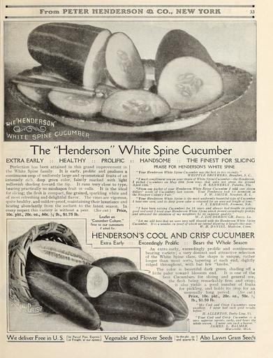 | Keywords: Everything for the garden (16204616739).jpg From PETER HEBJDE1SO <br> CO 09 MEW YOEU <br> WhWe spTne cucum 6Er <br> The Henderson ' White Spine Cucumber <br> EXTRA EARLY <br> HEALTHY <br> PROLIFIC <br> HANDSOME <br> THE FINEST FOR SLICING <br> Perfection has been attained in this grand improvement in <br> the White Spine family It is early prolific and produces a <br> continuous crop of uniformly large and symmetrical fruits of an <br> intensely rich deep green color faintly marked with light <br> yellowish shading toward the tip It runs very close to type <br> bearing practically no misshapen fruit or culls It is the ideal <br> for slicing; the flesh is compact fine grained sparkling white and <br> of most refreshing and delightful flavor The vines are vigorous <br> quite healthy and mildew-proof maintaining their luxuriance and <br> bearing abundantly from the earliest to the latest season In <br> every respect this variety is without a peer See cut Price <br> 10c pkt 20c oz 60c M lb 1 75 lb ž <br> Leaflet on <br> Cucumber Culture <br> free to our customers <br> if asked for <br> PRAISE FOR HENDERSON'S WHITE SPINE <br> Your Henderson White Spine Cucumber was the best in this vicinity <br> WHIPPLE BROTHERS Beaufort S C <br> I must compliment you on your strain of White Spine Cucumber ” the Henderson <br> I picked Cucumbers on May 28th from vines that were not above the ground <br> April 16th C H KENNERLY Palatka Fla <br> From one packet of your Henderson White Spine Cucumber I sold over eleven <br> dollars' worth of Cucumbers last season Your Ponderosa took 1st premium at <br> the Newport Country Fair F W SMITH Newport R 1 <br> Your Henderson White Spine is the most uniformly beautiful type of Cucumber <br> I have ever seen and its deep green color is retained for an unusual length of time <br> F T EMERSON Fremont Neb <br> I have been raising Cucumbers for IB years and always had trouble in getting <br> good seed until I tried your Henderson White Spine which proved exceedingly prolific <br> and attracted the attention of my neighbors by its superior quality <br> W J LOUDERBOUGH Daisy La <br> Let me add here that we were very well pleased with the Henderson White Spine <br> Cucumber It is a wonder in proof of which we intend planting it largely this year <br> W H DANIEL Madison Conn <br> HENDERSON'S COOL AND CRISP CUCUMBER <br> Extra Early Exceedingly Prolific Bears the Whole Season <br> An extra early exceedingly prolific and continuous- <br> bearing variety; a very distinct and attractive selection <br> of the White Spine class; the shape is unique rather <br> longer than most sorts tapering at each end slightly <br> ridged throughout with but few knobs <br> The color is beautiful dark green shading off a <br> little paler toward blossom end It is one of the <br> best Cucumbers for slicing and general use <br> tw the flesh being remarkably firm and crisp; <br> j it also yields a good number of fruits <br> for pickling and holds its crop for an <br> 'X unusually long period See cut <br> Price 10c pkt 20c oz 50c <br> lb 1 50 lb <br> Yl <br> My Cool and Crisp Cucumbers were <br> excellent I never had such good results <br> before <br> H ALLERTON Derby Line VI <br> Your Cool and Crisp Cucumber is a- <br> very superior variety early and bears the <br> whole season I never saw such a bearer ' r <br> JAMES L BALMER <br> Marysville Mich <br> We deliver Free in U S ftgg SS Vegetable and Flower Seeds j f' t Also Lawn Grass Seeds 43874825 149634 78295 Page 33 Text http //www biodiversitylibrary org/page/43874825 c1915 10 5962/bhl title 78295 Henry G Gilbert Nursery and Seed Trade Catalog Collection ; Peter Henderson Co NameFound Palatka NameConfirmed Palatka EOLID 8893268 NameBankID 2627509 Biodiversity Heritage Library Everything for the garden 1915 Garden Stories Books Bulbs Plants Catalogs Equipment and supplies Flowers Gardening Lawn mowers Seeds U S Department of Agriculture National Agricultural Library bhl page 43874825 dc identifier http //biodiversitylibrary org/page/43874825 bhlGardenStories BHLinbloom bulbs plants u s department of agriculture national agricultural library bhlgardenstories bhlinbloom Information field Flickr posted date ISOdate 2015-01-28 Check categories 2015 August 25 CC-BY-2 0 BioDivLibrary https //flickr com/photos/61021753 N02/16204616739 2015-08-25 03 02 38 cc-by-2 0 PD-old-70-1923 Everything for the garden 1915 Photos uploaded from Flickr by Fæ using a script |