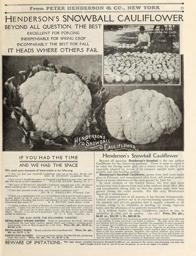 | Keywords: Everything for the garden (16204921607).jpg Frosmi FETEM MEHPEIRSOM ® C© ž HEW YOM <br> 25 <br> Hendersons SNOWBALL CAULIFLOWER <br> BEYOND ALL QUESTION THE BEST <br> EXCELLENT FOR FOKCING <br> INDISPENSABLE FOR SPRING CROP <br> INCOMPARABLY THE BEST FOR FALL <br> IT HEADS WHERE OTHEKS FAIL <br> IF YOU HAD THE TIME <br> AND WE HAD THE SPACE <br> We could quote thousands of letters similar to the following <br> I may say that your Snowball Cauliflower came up in five days 98 per cent <br> germinating GEO M DICKSON Leominster Mass <br> Last season I bought two ounces of Snowball Cauliflower at your store and grew <br> over ISO barrels of fine Cauliflower WALTER KNOPP Ramsay N J <br> My patch of Henderson's Snowball Cauliflower averaged over 5 lbs the largest <br> beine something over 13 inches in diameter J E THREFT Bristow Okla <br> I have had splendid results from your Snowball Cauliflower seed <br> Mrs H C WHELLAMS Winnipeg Can <br> I mail you a photograph of the case of Cauliflower which won the highest award ” – <br> a silver medal ” at the St Louis Exposition 1 grew it from your Snowball seed <br> For reliability of heading fine texture and whiteness of curd I have never grown any <br> Cauliflower that equals it R E HISTED South Haven Conn <br> I enclose a photo of a head of Henderson's Snowball Cauliflower which weighed <br> 4 pounds I have tried five varieties of Cauliflower and find none that compares <br> with yours The heads are so much whiter harder and more perfect inform than <br> others Besides it has not got a granulated surface like many others and is much <br> earlier in maturing Dr E A LEE Jennings La <br> WE ALSO OFFER THE FOLLOWING VARIETIES <br> EXTRA-EARLY DWARF ERFURT Until we introduced Snowball this - was <br> considered the best early variety; plaats dwarf and compact forming good- <br> sized heads; sown in May is good for a fall crop Price 20c pkt 3 25 oz <br> 10 00 M lb- <br> EXTRA-EARLY PARIS Heads uniform and of medium size Price 10c pkt <br> 80c oz 2 75 4 lb <br> LARGE LATE ALGIERS A strong-growing variety for late fall use producing <br> large fine heads Price 10c pkt 75c oz 2 50 M lb <br> Henderson's Snowball Cauliflower <br> Beyond all question Henderson's Snowball is the one perfect <br> Cauliflower for the American gardener There is none to equal it <br> in value for forcing under glass for a winter crop for which it is <br> especially adapted by reason of its compact upright habit quick <br> growth and sure-heading quality <br> Henderson's Snowball Cauliflower grown from seed sown under <br> glass in February and transplanted after frost will produce perfect <br> heads of snowy whiteness in the open ground by June 1st <br> In most sections of the United States the best and most <br> satisfactory crop is grown from seed sown outdoors about May 20th <br> and transplanted during July so that the plants make their best <br> growth during the cooler months For this crop Henderson's <br> Snowball is unsurpassed <br> For all purposes and at all seasons it has become indispensable <br> Critical market growers use it in ever-increasing quantities while <br> the amateur and private gardener find it equally valuable at all <br> seasons owing to its reliability in heading its strong vigorous <br> habit and the whiteness of its perfectly-formed flowers <br> It is without doubt the ideal Cauliflower perfect in size in <br> reliability in color and in quality See cut Price 25c pkt <br> 4 00 oz 12 50 H lb 45 00 lb <br> Although Cauliflower may be grown as easily as Cabbage many through lack <br> of knowledge of some essentials are liable to failure We urge those who are <br> not familiar with its cultivation to read carefully the pamphlet we have prepared <br> on Cabbage and Cauliflower growing wherein we have tried to point the way <br> to success We may say here briefly that success depends on growing a large <br> plant and that as Cauliflower is essentially a cool weather plant this cannot be <br> done in the hot summer months; therefore the earliest outdoor crop must be <br> grown from seed sown under glass in February so that the crop will mature by <br> June 1st; for fall use it should be sown late in May so that the best development <br> may be made during the cooler weather of September and October <br> BEWARF OF I II I A I lOI JS e bave always controlled Henderson's Snowball Cauliflower any statement to the contrary notwithstanding and unless the <br> /\I\L_ \ /l 11 11 1 r i 1 l yi U seec j j s b OU g nt directly from us you do not get the genuine as we do not supply it to dealers 43874817 149634 78295 Page 25 Text http //www biodiversitylibrary org/page/43874817 c1915 10 5962/bhl title 78295 Henry G Gilbert Nursery and Seed Trade Catalog Collection ; Peter Henderson Co Biodiversity Heritage Library Everything for the garden 1915 Garden Stories Books Bulbs Plants Catalogs Equipment and supplies Flowers Gardening Lawn mowers Seeds U S Department of Agriculture National Agricultural Library bhl page 43874817 dc identifier http //biodiversitylibrary org/page/43874817 bhlGardenStories BHLinbloom bulbs plants u s department of agriculture national agricultural library bhlgardenstories bhlinbloom Information field Flickr posted date ISOdate 2015-01-28 Check categories 2015 August 25 CC-BY-2 0 BioDivLibrary https //flickr com/photos/61021753 N02/16204921607 2015-08-25 03 00 43 cc-by-2 0 PD-old-70-1923 Everything for the garden 1915 Photos uploaded from Flickr by Fæ using a script |