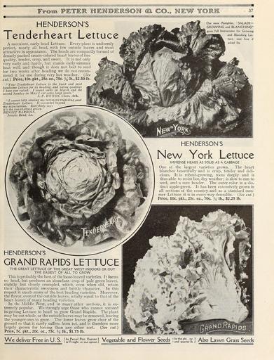 Keywords: Everything for the garden (16204943827).jpg F ®m PETE1R HEHDEIRSOM <br> COo MEW YOIR3 <br> 37 <br> HENDERSON'S <br> Tenderheart Lettuce <br> A succulent early head Lettuce Every plant is uniformly <br> perfect nearly all head with few outside leaves and most <br> attractive in appearance The heads are compactly formed of <br> densely packed cream-colored heart leaves of fine <br> quality tender crisp and sweet It is not only <br> very early and hardy but stands early summer <br> heat well and though it does not bolt to seed <br> for two weeks after heading we do not recom- <br> mend it for use during very hot weather See <br> cut Price 10c pkt 25c oz 75c \i lb 2 50 lb <br> Your Tenderheart Lettuce is the finest and most <br> handsome Lettuce for its heading and eating qualities <br> I have ever raised 1 sowed seeds in March and the <br> second Sunday in May 1 cut extra large heads <br> J F HYNDS Cloar Ark <br> I cannot help sending my testimony regarding your <br> Tenderheart Lettuce It succeeded beyond <br> my expectations Everybody says <br> it is the fineslLeltuce grown ' <br> BENOIT BARROIS <br> Jesuits Bend La <br> Our new Pamphlet SALADS- <br> GROWING and BLANCHING <br> gives full Instructions for Growing <br> and Blanching Let- <br> tuce sent free if <br> asked for <br> HENDERSON'S <br> New York Lettuce <br> IMMENSE HEADS AS SOLID AS A CABBAGE <br> One of the largest varieties grown The heart <br> blanches beautifully and is crisp tender and deli- <br> cious It is robust-growing roots deeply and is <br> thus able to resist hot dry weather; is slow to run to <br> seed and a sure header The outer color is a dis- <br> tinct apple-green It has been extensively grown in <br> all sections of the country and as a standard sum- <br> mer Lettuce it is in everyway desirable See cut <br> Price 10c pkt 25c oz 70c \i lb 2 25 lb <br> HENDERSON'S <br> GRAND RAPIDS LETTUCE <br> THE GREAT LETTUCE OF THE GREAT WEST INDOORS OR OUT <br> THE EASIEST OF ALL TO GROW <br> This is probably the best of the loose- leaved varieties It forms <br> no head but produces an abundant crop of pale green leaves <br> slightly but closely crumpled which even when old retain <br> their characteristic sweetness and brittle character In this <br> respect it excels many of the best heading varieties Moreover <br> the flavor even of the outside leaves is fully equal to that of the <br> heart leaves of many heading varieties <br> In the Middle West and in many other sections it is ex- <br> tremely popular We strongly urge those who cannot succeed <br> in getting Lettuce to head to grow Grand Rapids The plant <br> may be cut whole or the outside leaves may be removed leaving <br> the younger ones to grow The lower leaves grow clear of the <br> ground so that it rarely suffers from rot and is therefore more <br> largely grown for forcing than any other sort See cut <br> Price 5c pkt 20c oz 55c Y± lb 1 75 lb <br> Cr d Rapi ds <br> We deliver Free in U S £ Jgg£;l Vegetable and Flower Seeds ; Also Lawn Grass Seeds 43874829 149634 78295 Page 37 Text http //www biodiversitylibrary org/page/43874829 c1915 10 5962/bhl title 78295 Henry G Gilbert Nursery and Seed Trade Catalog Collection ; Peter Henderson Co Biodiversity Heritage Library Everything for the garden 1915 Garden Stories Books Bulbs Plants Catalogs Equipment and supplies Flowers Gardening Lawn mowers Seeds U S Department of Agriculture National Agricultural Library bhl page 43874829 dc identifier http //biodiversitylibrary org/page/43874829 bhlGardenStories BHLinbloom bulbs plants u s department of agriculture national agricultural library bhlgardenstories bhlinbloom Information field Flickr posted date ISOdate 2015-01-28 Check categories 2015 August 25 CC-BY-2 0 BioDivLibrary https //flickr com/photos/61021753 N02/16204943827 2015-08-25 03 01 36 cc-by-2 0 PD-old-70-1923 Everything for the garden 1915 Photos uploaded from Flickr by Fæ using a script |