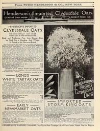| Keywords: Everything for the garden (16205000637).jpg Frosst PETE3R HEMDEIRSOM ® CO MEW YORK <br> 71 <br> erson'silmpqxted Clv lesdale Oats <br> 5 -S Tji 2 - 2 <br> e Si _ il/IA <br> DIRECT FROM US <br> HENDERSON'S IMPORTED <br> Clydesdale Oats <br> THE MOST POPULAR HIGH-GRADE <br> WHITE OAT IN THE UNITED STATES <br> Early and Productive ” Free from Disease ” Does <br> not Shell Out in Handling ” And Weighs <br> 50 Pounds to the Measured Bushel <br> Since we introduced this Grand Oat it has steadily and deservedly <br> gained in popularity until to-day it is the most popular High-Grade <br> White Oat in the United States The climate of America is unsuited <br> to the production and maintenance of the highest grade of Oats and <br> unless a heavy imported British Oat be used for seed purposes at least <br> every second or third year theybecomelight chaffy inferior in quality <br> and unprofitable The ultimate financial benefit accruing to the Amer- <br> ican farmers by the annual distribution of several thousand bushels of <br> Henderson's Clydesdale Oats cannot be overestimated These Oats <br> weigh naturally 30 lbs per measured bushel and they deteriorate in <br> weight only from 3 to 4 lbs each year they are grown here so that <br> the produce is worth for seed purposes at least double the market value <br> ¢ of ordinary Oats No other Oat can show such a record ” 75 to 100 <br> bushels per acre and double the usual quantity of straw Another most <br> important advantage of Henderson's Clydesdale Oats to the farmer <br> is the fact that they have been thoroughly cleaned by the latest and <br> most improved machinery and are absolutely free from weed seeds <br> Sow 3 bushels per acre See cut <br> PRICE Imported Clydesdale Oats per peck 0 65 <br> Per Standard bushel of 32 lbs 2 10 <br> 10-bushel lots and upward per bushel 2 00 <br> 100-bushel lots per bushel 1 90 <br> GENUINE ONLY DIRECT FROM HENDERSON'S <br> The Clydesdale Oats are a revelation On 2 acres I raised 160 bushels <br> of the plumpest Oats I ever saw <br> W G KOEPPEN Hillsdale N Y <br> LONG'S <br> WHITE TARTAR OATS <br> THE IDEAL SIDE OAT FOR THE AMERICAN FARMER <br> The earliest heaviest and most prolific domestic-grown Side Oat in cul- <br> tivation It is suitable for all soils; of robust and vigorous constitu- <br> tion is remarkably early and an immense cropper; the straw is long <br> and stout stands up well and does not readily lodge or twist The <br> heads measure from 8 to 10J inches and the kernels are of immense <br> size thick plump and heavy it is undoubtedly the heaviest cropping <br> domestic white Oat ever offered <br> Its extreme earliness great length and strength of straw thick plump <br> grains and the heavy yields it is capable of producing give Long's White <br> Tartar all the necessary qualifications which go to make an ideal Oat <br> Sow 3 bushels per acre <br> PRICE Long's White Tartar Oats per peck 0 50 <br> Per Standard bushel of 32 lbs 1 55 <br> 10-bushel lots and upward per bushel 1 50 <br> 100-bushel lots per bushel 1 45 <br> I wish to call your attention to the Long's White Tartar Oats which <br> 1 bought from you They are very fine Yield 82 bushels 11 lbs per acre <br> R S CLARK Maple Shade Farm Dillsburg Pa <br> EARLY <br> NEWMARKET OATS <br> A grand new breed of English pedigree Oats of wonderfully vigorous <br> growth producing very early a heavy crop of unusually large plump <br> Oats remarkable for their thinness of husk which greatly adds to <br> their feeding value The straw is tall and strong withstanding unfa- <br> vorable weather well and is practically immune from rust For quality <br> earliness vitality and productiveness the Early Newmarket Oat is un- <br> surpassed Sow 3 bushels per acre <br> PRICE Early Newmarket Oats per peck 0 55 <br> Per Standard bushel of 32 lbs 1 60 <br> 10-bushel lots and upward per bushel 1 55 <br> 100-bushel lots per bushel 1 50 <br> ” IMPORTED ” <br> STORM KING OATS <br> We have pleasure recommending this true White Tartarian or Side Oat It is a <br> heavy cropper; the grain is short plump thin-skinned and of the highest feeding value <br> and the straw as its nameimplies is very strong and stiff enabling it to resist the severest <br> weather The weight of the grain per measured bushel is 46 lbs The past year's <br> experience has fully borne out our good opinion of Storm King Wherever grown <br> the yield of both grain and straw was satisfactory We advise every grower of Oats to <br> try this variety Sow 3 bushels per acre See cut page 74- <br> PRICE Imported Storm King Oats per peck 0 65 <br> Per Standard bushel of 32 lbs 2 10 <br> 10-bushel lots and upward per bushel 2 00 <br> 100-bushel lots per bushel 1 90 <br> The Oats I bought of you made a wonderful showing I planted 20 acres with your <br> seed and 20 acres with the best seed I could buy in Richmond There is absolutely no <br> comparison between the two The field from your Oats is the prettist sight on the farm <br> They have grown higher and faster than anything we have been used to <br> F H NILES Rock Castle Va <br> HENDERSON'S FARMERS' MANUAL An Up-to-Date Catalogue of All Farm Seeds Mailed Free on Request 43874863 149634 78295 Page 71 Text http //www biodiversitylibrary org/page/43874863 c1915 10 5962/bhl title 78295 Henry G Gilbert Nursery and Seed Trade Catalog Collection ; Peter Henderson Co Biodiversity Heritage Library Everything for the garden 1915 Garden Stories Books Bulbs Plants Catalogs Equipment and supplies Flowers Gardening Lawn mowers Seeds U S Department of Agriculture National Agricultural Library bhl page 43874863 dc identifier http //biodiversitylibrary org/page/43874863 bhlGardenStories BHLinbloom bulbs plants u s department of agriculture national agricultural library bhlgardenstories bhlinbloom Information field Flickr posted date ISOdate 2015-01-28 Check categories 2015 August 25 CC-BY-2 0 BioDivLibrary https //flickr com/photos/61021753 N02/16205000637 