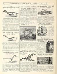 | Keywords: Everything for the garden (16205249657).jpg 188 <br> THE <br> HENDERSON CHILLED PLOW <br> A Grand Plow Lightest Draft Runs Steady Correct <br> Shape Harder than Steel <br> THE HENDERSON CHILLED PLOWS are hon- <br> estly made of best materials correctly shaped and <br> balanced to do grand work Easy on both team and <br> plowman and we are certain they are not surpassed <br> by any other make The mold is harder than steel <br> scours like glass in any soil and turns a beautiful <br> furrow All improvements including inclining land- <br> side adjustable beam and wheei Shin piece remov- <br> able for sharpening <br> No <br> Henderson Chilled Plows <br> Sizes Furrow <br> Light 1 horse 4x9 in <br> Medium 1 horse 5x10 in <br> Full 1 horse -5 x11 in <br> Medium 2 horse 7x13 in <br> Full 2 horse Sxl4 in <br> Price With <br> plain wheel <br> S5 25 <br> 6 50 S7 25 <br> 7 75 8 50 <br> 9 50il0 25 <br> 10 25 11 50 <br> wheel <br> and <br> skim <br> 12 25 <br> 13 50 <br> THE HENDERSON PERFECT <br> STEEL PLOW <br> Mouldboard shinpiece and landside are of tem- <br> pered steel; the beam is also of steel and will not <br> bend nor break The entire design is perfection in <br> shape turning the furrow clear over and grass <br> weeds and manure entirely under; it scours like glass <br> in all soils and works beautifully in either loam with- <br> out body or muck <br> Price of the Henderson Perfect Steel Plow <br> with a chilled carbonate share regular two-horse <br> size cuts 5 to 8 inches deep by 10 to 15 inches wide <br> plain 13 00; with wheel S14 00; with wheel and <br> jointer S15 00 <br> HENDERSON'S GOLD MEDAL <br> SUBSOIL PLOW <br> By following the plow with a sub-soil plow the <br> earth can be broken to a depth of from 15 to 20 <br> inches giving roots a wider range for food so plants <br> are hardly affected by excessive drought or a wet <br> season The Gold Medal penetrates the sub-soil <br> easily breaks the hard pan and pulverizes it without <br> bringing any to the surface The one-horse plow will <br> reach to a depth equal to the height of its standard <br> 15 to 16 inches and the two-horse plow to the <br> depth of 20 inches Prices for one-horse with wheel <br> and draft rod S7 00; for two-horse with wheel <br> and -draft rod SS 00 Extra shares 1 horse 50c <br> 2 horse 80c <br> iiiiuiiiiiiiiiiniiiiiiiiiiniNiiiiiiiiiiiiinin <br> Reduce the Labor and Cost of Blanching Your <br> Celery Crop One-Half by Using <br> R AND D CELERY PAPER <br> This celery blanching paper made specially for <br> the purpose from a patented compound is odorless ' <br> tough and strong not affected by wet nor by ex- <br> tremes of heat and cold and if cared for can be used <br> over and over again for years It is easily and <br> quickly placed in position costing less than half the <br> price of boards it greatly reduces the expense of <br> blanching a crop of celery by either boards or bank- <br> ing This paper conforms to the foliage excluding <br> all light the celery blanches quickly is clean and <br> bright and not so susceptible to rust and heart rot <br> even in warm weather <br> Net Prices of R and D Celery Paper and Acces- <br> sories <br> 10 inches wide in 100 ft rolls 51 50 per roll 513 00 <br> per 1000 running feet <br> 12 inches wide in 100 ft rolls 1 75 per roll 15 00 <br> per 1000 running feet <br> Galvanized wires for arches to hold paper in place <br> in bundles of 500 straight wires <br> 42 in long for single rows 4 00 per 1000 <br> 48 in long for double rows 7 50 per 1000 <br> Un-winding Pipe with bottom disc 50c ea <br> Re-winders 55 00 each <br> Wire Bender 53 00 each <br> EARL'S CELERY PAPER PLACER <br> With this machine two men can place in position <br> celery blanching paper at the rate of an acre a day <br> One man draws the machine the other follows and <br> thrusts in the wire arches ever 7 3 or 4 feet to hold <br> the paper in position The machine -rides on four <br> wheels and straddles the row carrying a roll of paper <br> on each side of the row which unreels as fast as the <br> man can walk The R and D Celery Blanch- <br> ing Paper offered -above is recommended as the best <br> although its first cost is higher Price of Earl's <br> Celery Paper Placer S50 00 net <br> PLANET JR ALL-STEEL <br> HORSE HOE CULTIVATOR <br> Cultivates Hoes <br> Furrows Covers <br> Price of Xo 8 <br> in Hie cut S3 2 <br> This grand implement is without a peer as a labor <br> saver It is no ordinary heavy clumsy cultivator <br> but made scientifically correct and entirely of steel <br> The patent frame is extra long and high the hollow <br> standards are remarkably strong and light The <br> teeth hoes etc are of the finest quality of case- <br> hardened polished steel and correctly shaped and <br> curved The cultivator teeth can be set to any <br> pitch; the hoe standards can be swivelled to any <br> angle or entirely around to throw much or little <br> soil either to or from the plants The lever wheel <br> instantly regulates the depth and locks The lever <br> expander widens or narrows the implement to work <br> in uneven rows The handles can be quickly set <br> to either side and the height can be changed to suit <br> the operator Weight 82 lbs Price Planet Jr <br> No 8 as shown in cut S9 25 <br> THE HENDERSON LEVER-SET <br> ALL-STEEL HARROW <br> A Spike-Tooth Harrow with Lever Up A Smoothing <br> Harrow with Lever Down <br> The teeth can be instantly set at any angle from a <br> forward pitch to straight up and down or slanting <br> backward the lever-catch holding them securely in <br> the desired position Prices No A 1-horse 1 section <br> 25 teeth cuts 4 ft S7 00 No B 1 horse 1 section <br> 30 teeth 5 ft cut S7 75 No C 2-horse 2 section <br> 50 teeth cuts 8 ft S13 00 No D 2 horse 2 sec- <br> tions 60 teeth 10 ft cut S14 00 <br> CAHOON'S IMPROVED <br> BROADCAST SEED SOWER <br> Will sow all <br> kinds of grass <br> and grain seeds <br> from 4 to 8 <br> acres per hour <br> at a common <br> walki