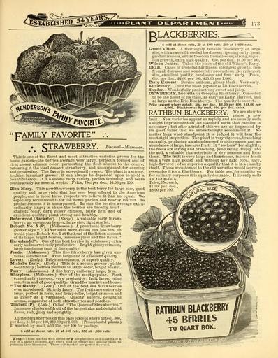 | Keywords: Everything for the garden (16231936454).jpg RLAINT DEPARTIVIEIMT' <br> 173 <br> p AMILY FAVORITE <br> STRA ERRY <br> Bisexual Midseason <br> This is one of the finest and most attractive varieties grown for the <br> home garden the berries average very large perfectly formed and of <br> rich glossy crimson color permeating the flesh almost to the centre <br> rendering it the ideal dessert strawberry and unsurpassed for canning <br> and preserving The flavor is exceptionally sweet The plant is a strong <br> healthy luxuriant grower; it can always be depended upon to yield a <br> bountiful crop It is a second early variety perfect flowering and bears <br> continuously for several weeks Price 75c per doz 4 00 per 100 <br> Glen Mary This new Strawberry is the best berry for large size good <br> quality and large yield that has ever been offered to the American <br> people and in these three respects we believe it has no equal We <br> especially recommend it for the home garden and nearby market In <br> productiveness it is unsurpassed In size the berries average extra- <br> ordinarily large ; in shape the berries are broadly heart- <br> shaped ; color dark glossy crimson fairly firm and of <br> excellent quality; plant strong and healthy <br> Bederwood Rackster Early A valuable early Straw- <br> berry ; an enormous bearer large size light scarlet <br> Bubacb No 5 P Midseason A prominent Strawberry <br> grower says If all varieties were culled out but ten he <br> would place Bubach No 5 at the head of the list on account <br> of its large bright berries immense yield and fine flavor <br> Haverland P One of the best berries in existence ; extra <br> early and marvelously productive Bright glossy crimson <br> large handsome fruit of fine quality <br> Jessie Midseason This fine Strawberry has given uni- <br> versal satisfaction Fruit large and of excellent quality <br> Lovett Early Brightest crimson of superb quality <br> Michel's Early Early This is a robust grower ; yields <br> bountifully ; berries medium to large color bright scarlet <br> Parry Midseason A fine berry uniformly large firm <br> Sharpless Midseason One of the most popular Plant <br> exceedingly vigorous very productive ; fruit large crim- <br> son firm and of good quality Grand for market and home <br> The Gandy Late One of the best late Strawberries <br> ever introduced Strictly fancy The fruits are uniformly <br> large perfect in form and firm ; color bright crimson and <br> as glossy as if varnished Quality superb delightful <br> aroma suggestive of both strawberries and peaches <br> Timbrell P Late Called The Queen of Strawberries <br> Immense clusters of fruit of the largest size and delightful <br> flavor rich juicy and sprightly <br> All the Strawberries on this page except where noted 30c <br> per doz SI 50 per 100 10 00 per 1 000 Transplanted plants <br> If wanted by mail add 25c per 100 for postage <br> 6 sold at dozen rate 25 at 100 rate 250 at 1 000 rate <br> p LACKBERRIES <br> 6 sold at dozen rate 25 at 100 rate 250 at 1 000 rate <br> Lovett's Best A thoroughly reliable Blackberry of large <br> size with a cane of ironclad hardiness ; ripening early great <br> productiveness entire freedom from disease; strong vigor- <br> ous growth extra high quality 60c per doz 4 00 per 100 <br> Wilson Junior Takes the place of the old Wilson's Early <br> ERIE Canes of ironclad hardiness strongest growth free <br> from all diseases and wonderfully productive Berry largest <br> size excellent quality handsome and firm ; early Price <br> 60c per doz 4 00 per 100 25 00 per 1 000 <br> Early Harvest Berries uniform glossy black Very early <br> Kittatinny Once the most popular of all Blackberries <br> Snyder Wonderfully productive ; sweet and juicy <br> DEWBERRY Lucretia or Creeping Blackberry Conceded <br> to be the finest of its class as early as Early Harvest and <br> as large as the Erie Blackberry The quality is superb <br> Price except where noted 50c per doz 3 00 per 100 15 00 per <br> 1 000 Blackberries by mail 10c per doz extra <br> RATHBUN BLACKBERRY <br> We are slow to <br> praise a new <br> fruit New varieties appear so rapidly and are usually such <br> a slight improvement on the standard sorts that caution is <br> necessary ; but after a trial of this we are so impressed by <br> its great value that we unhesitatingly recommend it No <br> matter from what standpoint it is judged it will bear the <br> most rigid inspection The plant is very vigorous branching <br> naturally producing an abundance of fruiting canes and an <br> abundance of large lusciousf ruit It suckers but slightly <br> the roots are strong and branching penetrating deeply into <br> the soil a valuable characteristic in dry seasons and loca- <br> tions The fruit is very large and handsome intense black <br> with a very high polish and without any hard core juicy <br> high-flavored ; of so superior a quality that it is in a class by <br> itself Those accustomed to the old varieties would scarcely <br> recognize it for a Blackberry For table use for canning or <br> for culinary purposes it is equally desirable It literally melts <br> in the mouth <br> Price 15c each <br> 1 50 per doz <br> 8 00 per 100 <br> Xfote Those marked with the letter P are pistillate and must have a <br> row of a perfect-flowered sort every nine or twelve feet among them to <br> poUenize their blossoms Those not marked are perfec -flowered 42383262 133997 66553 Page 173 Text http //www biodiversitylibrary org/page/42383262 1902 10 5962/bhl title 66553 Henry G Gilbert Nursery and Seed Trade Catalog Collection ; Peter Henderson Co NameFound Lucretia Biodiversity Heritage Library Everything for the garden 1901 Garden Stories Catalogs Flowers Peter Henderson Co Plants Ornamental Seed industry and trade Seeds Trade catalogs Vegetables U S Department of Agriculture National Agricultural Library bhl page 42383262 dc identifier http //biodiversitylibrary org/page/42383262 bhlGarde
