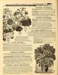 | Keywords: Everything for the garden (16234331883).jpg 164 <br> m <br> PETER HENDERSON 6; CO NEW YORK- <br> ERBACEOUS HYDRANGEAS <br> Thos Hogg Pure white very large <br> Otaksa Beautiful light pink <br> Red Branched Rosy pink red stems <br> Price large plants 50c each 4 50 per doz <br> HARDY GRASSES <br> Arundo Donax A giant reed growing 10 or 12 feet high <br> Arundo Donax Var A variegated form of the above <br> Erianthus Ravennae American Pampas Grass A tali graceful grass grow- <br> ing 6 to 8 feet handsome plumes in fall Perfectly hardy and very ornamen- <br> tal on lawns It makes a large handsome clump <br> Eulalla Gracillima Narrow green foliage Very graceful and attractive <br> Eulalia Zebrina Marked transversely with golden bars A most unique plant <br> Eulalia Japonica Var Leaves striped white Large spikes of handsome <br> plumes One of the handsomest variegated plants in existence for lawns <br> Phalaris Var Gardener's Garters Striped green and white 2 ft 15c each <br> Price 30c each 3 00 per doz <br> HIBISCUS CHINESE <br> These are largely used for bedding purposes and attract a great deal of <br> attention ; they are almost continually in bloom Equally valuable for pots <br> Price 15c each 4 for 50c 12 for 1 25 <br> HENDERSON'S DOUBLE HOLLYHOCKS <br> HENDERSON'S SUPERB This grand strain of Hollyhocks we have <br> secured only after years of careful selection We grow annually thousands <br> of these and have for years selected those that show the most perfect <br> form largest size and purest color We offer the following colors Lav- <br> ender Purple Crimson White Salmon Yellow Rose Pink Blush <br> Maroon White with Violet Centre Strong plants 20 c each 2 00 <br> per doz ; set of 11 for 2 00; 15 00 per 100 <br> Dwarf Japanese Hollyhock Grows about 18 inches high large semi- <br> double flowers Very attractive Price 25c each 2 50 per doz <br> I EMOINE'S QIANT H ELIOTROPES <br> Efforts to improve the Heliotrope have been persistently made by experts <br> all over the world for a number of years and at last these efforts have been <br> successful; realization has surpassed the most ardent expectation One can <br> scarcely recognize the old garden favorite in its new glorified form The <br> size of the foliage and its quality are doubled ; the habit of the plant is made <br> compact and bushy instead of being scraggy and sprawling ; the size of the <br> flowers is magnified beyond belief specimen heads measuring ten to fifteen <br> inches across See cut Price 15c each 4 for 50c 12 for 1 25 <br> Note ” We can supply the ordinary HeliotropeB all fine sorts fragrant blue lavender <br> and white at 10c each ifl OO per doz 6 00 per 100 <br> DOUBLE FUCHSIAS <br> Elm City Deep plum color corolla; crimson sepals <br> MOLESWORTH White corolla; crimson sepals See <br> cut No 2 <br> Mme Bruant Lilac-mauve veined with rose; red sepals <br> PHENOMENAL Dark plum color enormous size See <br> cut No i <br> Pres F Gunther Light prune corolla ; rich red sepals <br> Rozains Patrie White corolla; deep carmine sepals <br> Trophee Violet-blue corolla; very dark red sepals waxy <br> lustre Price 10c each 1 00 per doz <br> SINGLE FUCHSIAS <br> Beacon Rich carmine corolla; waxy white sepals <br> Black Prince Corolla and sepals waxy carmine <br> BRILLIANT Scarlet corolla ; white sepals See cut No 3 <br> CONSTANCY Carmine corolla; white sepals See cut <br> No 1 <br> Ernest Renan Carmine corolla; white sepals <br> Lottie Carmine corolla ; tender rose sepals <br> Mrs Marshall Tender rose corolla ; white sepals <br> Oriflamme Prune-colored corolla; crimson sepals <br> Speciosa Orange-scarlet corolla; white sepals <br> Surprise Magenta corolla border ; white sepals <br> Price 10c each 1 00 per doz <br> Variegated Fuchsia Sunray Foliage variegated green white cream <br> color bronze and rosy pink Large purplish red flowers <br> Price 15c each 1 50 per doz <br> NEW LARGEFLOWERING JAPAN IRIS <br> Iris Kaempferi Grandiflora The flowers are of enormous size aver- <br> aging from 6 to 8 inches across and of indescribable and charming hues <br> and colors varying like watered silk in the sunlight the prevailing colors <br> being white crimson rose lilac lavender violet and blue Each flower <br> usually representing several shades while a golden yellow blotch sur- <br> rounded by a halo of blue or violet at the base of the petals intensities the <br> wealth of coloring Perfectly hardy blooming in June <br> and July and attain greatest perfection if grown in <br> moist soil <br> Double Flow ered named varieties 25c each ; set of 12 <br> distinct sorts for 2 50 <br> Single Flowered named varieties 25c each ; set of 12 <br> distinct sorts for 2 50 <br> ALL COLORS MIXED 15c each 1 50 per doz <br> IRIS GERMANICA 10c each 1 00 per doz <br> LEMOINE'S OIA NT HELIOTnOPE 42383253 133997 66553 Page 164 Text http //www biodiversitylibrary org/page/42383253 1902 10 5962/bhl title 66553 Henry G Gilbert Nursery and Seed Trade Catalog Collection ; Peter Henderson Co NameFound Donax NameConfirmed Donax EOLID 45388 NameBankID 4934895 NameFound Erianthus NameConfirmed Erianthus EOLID 108084 NameBankID 465766 NameFound Eulalia NameConfirmed Eulalia EOLID 108151 NameBankID 652465 NameFound Gracillima NameConfirmed GRACILLIMA NameBankID 5330604 NameFound Hibiscus NameConfirmed Hibiscus L EOLID 60741 NameFound Speciosa NameConfirmed Speciosa NameBankID 5330982 NameFound Zebrina NameConfirmed Zebrina EOLID 2528548 NameBankID 464523 Biodiversity Heritage Library Everything for the garden 1901 Garden Stories Catalogs Flowers Peter Henderson Co Plants Ornamental Seed industry and trade Seeds Trade catalogs Vegetables U S Department of Agriculture National Agricultural Library bhl page 42383253 dc identifier http //biodiversitylibrary org/page/42383253 bhlGardenStories Fuschias Heliotropes BHLinbloom peter henderson co plants ornamental u s department of agriculture national agricultural library bhlgardenstories bhlinbloom Information field F