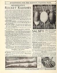 | Keywords: Everything for the garden (16364903506).jpg – II <br> 58 <br> EVERYTH1HG FOR THE GARDEN - Vegetable Seed <br> HENDERSON'S <br> Rocket Radishes <br> A dish composed of these three Rockets presents a most attractive <br> appearance when prepared for the table and we advise everyone to <br> grow some of each In addition to their bright appearance they are <br> among the earliest varieties grown and they mature at exactly the <br> same time For these reasons they are used very extensively for forcing <br> when they may be had in 2 1 days from sowing They do equally well <br> outdoors but in common with all Radishes must be grown under <br> conditions that induce rapid growth for only then will they acquire <br> proper flavor and crispness They must be pulled just as soon as ready <br> for like all quick growing Radishes they soon become pithy <br> WHITE-TIPPED ROCKET RADISH This is the ideal first early <br> Radish The color is deep rose tipped white at the base The <br> flavor is deliciously mild See cut Price 10c pkt 15c oz 35c <br> H lb 1 25 lb <br> WHITE ROCKET RADISH A trifle larger than Red Rocket It <br> has an equally small top; the root is pure white while the color of <br> the flesh is clear waxy-white See cut Price 10c pkt 15c oz <br> 35c M lb 1 25 lb <br> RED ROCKET RADISH This variety has a very small top which <br> permits close planting It is quite smooth deep scarlet in color <br> The flesh is crisp and of mild flavor See cut Price 10c pkt <br> 15c oz 35c M lb 1 25 lb <br> The Collection of 3 Rocket Radishes 1 pkt each for 25c; 1 oz each <br> for 40c; M lb each for 90c <br> OTHER OVAUSHAPED and LONG VARIETIES <br> 1 oz to 100 feet of drill <br> FRENCH BREAKFAST A favorite oval-shaped Radish bright scarlet with white <br> tip; excellent for family use Price 5c pkt 10c oz 30c M lb 1 00 lb <br> SCARLET OLIVE-SHAPED A very attractive oval-shaped variety bright scarlet <br> flesh white crisp and mild Price Sc pkt 10c oz 30c Ji lb 1 00 lb <br> LONG SCARLET The most popular long red variety may be used when quite <br> young Price 5c pkt 10c oz 30c \-i lb 1 00 lb <br> LONG WHITE VIENNA or Lady Finger Of attractive shape about 4 inches <br> long pure white mild and tender Price 5c pkt 10c oz 25c 4 lb 75c lb <br> SUMMER AND AUTUMN VARIETIES These grow larger need more room and <br> require from 6 to 8 weeks' time to mature <br> Giant White Stuttgart A large white oval-shaped summer Radish Very <br> tender and mild Price 5c pkt 10c oz 30c M lb 90c lb <br> Chartier A long handsome summer Radish; top crimson fading to white at <br> tip; flesh white and delicious remaining long in good condition Price <br> 5c pkt 10c oz 25c M lb 75c lb <br> Rose China A distinct half -long variety; skin rosy-red; flesh white and firm <br> and a good keeper Price 5c pkt 10c oz 30c M lb 90c lb <br> White Strasburg An early summer Radish 4 to 5 inches long and tapering; <br> flesh and skin white Price 5c pkt 10c oz 30c i lb 90c lb <br> Sandwich Henderson's A fine half-long summer Radish; skin and flesh white; <br> flavor delicate and mild Price 10c pkt 15c oz 35c 4 ' lb 1 00 lb <br> WINTER VARIETIES These grow firm and compact and will keep almost all <br> winter if stored in a dry cellar; they require 2 to 3 months to mature <br> Celestial or White Chinese An extra fine long white Radish; grows to an <br> enormous size; flesh firm mild and crisp Price 10c pkt 15c oz 35c <br> lb 1 00 lb <br> Long Black Spanish One of the best keepers Roots 8 inches long; skin blackish- <br> brown; firm white flesh Price 5c pkt 10c oz 30c lb 1 00 lb <br> Half-long Black Spanish Differs from the above in its shorter stockier <br> growth and blacker skin; flesh white compact and the mildest flavored of <br> this type; good keeper Price 10c pkt 15c oz 35c M lb 1 00 lb <br> RHUBARB or PIE PLANT <br> For roots see page 180 <br> Spring-sown seed produces roots which transplanted next spring <br> will yield a good crop the second year after sowing <br> ST MARTIN'S A large red stalked compact growing productive <br> variety It is very early juicy rich and spicy Price 10c pkt <br> 30c oz 1 00 34 lb <br> LINN-SsUS A very large thick red stalked late variety of fine <br> quality Price 5c pkt 20c oz 60c i lb 2 00 lb <br> AI IPV OR OYSTER <br> O i\ L 1 1 I a /» w t Mi PI ANT <br> of drill <br> Salsify is one of the best of our root vegetables and is rapidly <br> increasing in popularity It is grown in the same way as the <br> Parsnip and if grown in well prepared soil will produce large <br> smooth roots Failing this they are liable to fork <br> Cooked in any form Salsify is wholesome appetizing and nu- <br> tritious Its peculiar oyster-like flavor is most apparent when <br> sliced and fried and may also be served and eaten as Asparagus <br> It is one of the best remedies in various forms of indigestion <br> Most of its medicinal value is contained in the milk which exudes <br> from the skin the surface should therefore be broken as little as <br> possible This is best avoided by boiling whole and peeling <br> after cooking <br> MAMMOTH SANDWICH ISLAND The standard variety <br> produces large smooth roots of excellent quality See cut <br> Price 10c pkt 20c oz 50c \i lb 1 50 lb <br> LONG WHITE FRENCH The old variety equally good but <br> not so large as preceding See cut Price 5c pkt 15c oz <br> 40c M lb 1 25 lb <br> SCORZONERA or BLACK OYSTEK PLANT <br> A perennial plant resembling and grown like Salsify The <br> roots may be left in the ground and used after the first year <br> The skin is black flesh white; properly cooked it is most deli- <br> cious Price 10c pkt 25c oz 75c \i lb 2 50 lb <br> SEA KALE <br> The blanched leaf stalks are eaten boiled as Asparagus having <br> a fine agreeable flavor They are fit to cut the third year <br> from seed continuing to bear from 8 to 10 years The roots may <br> be forced in a warm cellar for a winter supply Price 10c pkt <br> 30c oz 90c H lb 3 00 lb <br> We deliver Free in U S by «