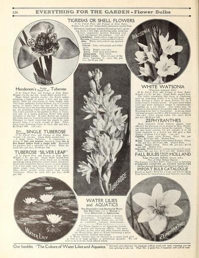 | Keywords: Everything for the garden (16365026116).jpg 126 <br> T1GRIDIAS OR SHELL FLOWERS <br> If by Parcel Post add Postage at Zone Rates <br> Weight 2 lbs per 100 Single Bulbs and dozens mailed <br> Extremely handsome summer-flowering bulbs grow <br> ing about 2 feet high producing large gorgeous <br> flowers exquisitely spotted flowering very <br> freely throughout the summer See cut <br> Conchiflora Dark yellow large red spots <br> Pavonia Crimson ; center mottled yellow <br> Alba White with yellow cup spotted <br> crimson <br> Lilacea Lilac with purple and white <br> spots <br> Rosea Bright rose color <br> Aurea Pure deep gold-yellow <br> Immaculata Pure white <br> Mixed Colors Price for any of the <br> above Tigridias 5c each; 50c per <br> doz ; 3 50 per 100 <br> Henderson's rwp i <br> Tube <br> rose <br> // by Parcel Post add Postage at Zone Rates <br> Weight 1 l /i lbs per doz Single Bulbs mailed Free <br> Plant dwarf growth stocky the flower spikes <br> attaining a height of about 2 feet and are com- <br> pactly rilled for two-thirds of their length with <br> very large perfectly double flowers \Yi to 2 inches <br> across or nearly twice the size of the old sort <br> The flowers have the wax-like substance of a Camel- <br> lia are glistening white and deliciously fragrant <br> The bulbs planted in the garden in May in warm <br> rich soil in a sunny position flower with great <br> certainty in the fall If early flowers are wanted <br> the bulbs may be started in pots in the house from <br> February to April removing the plants to open <br> ground when it is warm enough in May Price <br> extra large flowering bulbs 4c each; 40c per doz ; <br> 2 50 per 100 See cut <br> PcS Hn SINGLE TUBEROSE <br> // by Parcel Post add Postage at Zone Rates <br> Weight 1 lb per doz Single Bulbs mailed Free <br> A single white Tuberose It commences to <br> flower in July and August throwing from two to <br> five flower spikes from a single bulb Beautiful <br> for gardens and a splendid cut flower Price 6c <br> each; 65c per doz ; 5 00 per 100 <br> TUBEROSE SILVER LEAF <br> If by Parcel Post add Postage at Zone Rates <br> Weight 1 lb per doz Single Bulbs mailed Free <br> Showy and effective even when not in bloom <br> the foliage being distinctly striped white and green <br> Each bulb frequently throws up two or more spikes <br> 3 to 4 feet high each bearing from 25 to 40 pure <br> white single waxy flowers delicately perfumed <br> They flower several weeks earlier than double <br> Tuberoses Price 6c each; 65c per doz ; 5 00 <br> per 100 <br> WATER LILIES <br> and AQUATICS <br> Our Descriptive and Illustrated Water <br> Lily Price List will be Mailed to <br> those Interested on Application <br> In it will be found a full list of modern <br> Nymphaeas Nelumbiums Aquatic <br> Plants Aquarium Plants etc as well <br> condensed Cultural Instructions <br> Write for it- <br> WHITE WATSONIA <br> Watsonia Ardensei Alba <br> If by Parcel Post add Postage at Zone Rates <br> Weight 1 Y lbs per doz Single Bulbs mailed Free <br> The bulbs something like those of Gladiolus <br> send up branching stems 3 to 4 feet high each <br> stem bearing a dozen or more flowers 2 to 3 <br> inches long by 2 inches across Its pure snow-white <br> color and great substance render it exceptionally <br> beautiful as a cut flower The bulbs may be <br> planted in the spring in the garden like a Gladiolus <br> flowering from July to September A strong plant <br> will bear as many as 250 to 300 flowers in a summer <br> See cut Price strong bulbs 12c each; 1 25 <br> per doz ; S8 00 per 100 <br> ZEPHYRANTHES <br> Most beautiful dwarf bulbous plants; very- <br> effective for planting out in masses in May flower- <br> ing with great profusion during the summer They <br> are also most suitable for pot culture; 6 to 12 <br> bulbs clustered in a 6-inch pot will give a fine <br> display of bloom 1 foot high See cut <br> Candida Large white flowers Piice 50c per <br> doz ; 3 75 per 100 Mailed Free <br> Rosea Large beautiful rose-colored flowers Price <br> 50c per doz ; 3 75 per 100 Mailed Free <br> Aurea Bright yellow Price 50c per doz ; 3 75 <br> per 100 Mailed Free <br> Vercunda White flowers as large asthose of Z rosea <br> Price 50c per doz ; 3 75 per 100 Mailed Free <br> FALL BULBS „˘om HOLLAND <br> Tulips Hyacinths Daffodils Crocus and a <br> Host of Other Bulbous Beauties <br> The Largest and Best Bulbs That Come to America <br> STANDARD VARIETIES and CHOICE NOVELTIES <br> All Described and Especially Low- Priced in Henderson's <br> IMPOKT BULB CATALOGUE <br> Ready in April ” Send for a Copy and Let Us Book <br> Your Order for Importation and Delivery Next Fall <br> The Water Garden is an important feature <br> n garden and landscape effects The great <br> versity in size color and other features among <br> Water Lilies gives to Water Gardening a pecu- <br> fascination interest and charm <br> er Garden may be enjoyed in a sunny back yard <br> in large gardens or pretentious grounds We tell <br> in the book offered below <br> Olir honklot Thf Pilltliro of Wator I iliexianrl AnnatlVc illustrated gives directions for preparing artificial ponds and tanks wintering over the <br> Ur UUUKiei 1 lie V URUre Or V V aier l_UieS ana /AquailCb r00t5 growmg in tu b s etc Price 50c or given free if requested with a 5 00 order 43874918 149634 78295 Page 126 Text http //www biodiversitylibrary org/page/43874918 c1915 10 5962/bhl title 78295 Henry G Gilbert Nursery and Seed Trade Catalog Collection ; Peter Henderson Co NameFound Immaculata NameConfirmed Immaculata NameBankID 5138973 NameFound Lilac NameConfirmed Lilac P Miller 1754 NameFound Pavonia NameConfirmed Pavonia Cav EOLID 61666 NameFound Watsonia NameConfirmed Watsonia EOLID 50560 NameBankID 4935158 NameFound Zephyranthes NameConfirmed Zephyranthes EOLID 11381254 NameBankID 2665455 NameFound Zephyranthes rosea NameConfirmed Zephyranthes rosea EOLID 1083704 NameBankID 2669839 Biodiversity Heri