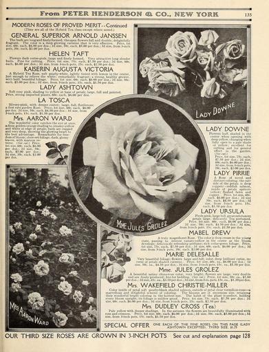 | Keywords: Everything for the garden (16391015065).jpg Fr©sm PETER HEMDERSOM CO MEW YOEUi <br> 135 <br> MODERN ROSES OF PROVED MERIT- Continued <br> They are all of the Hybrid Tea class except where noted <br> GENERAL SUPERIOR ARNOLD JANSSEN <br> The buds are long and finely formed ; the open flowers full and double; delightfully <br> fragrant The color is a deep glowing carmine that is very effective Price 1st <br> size 60c each 6 00 per doz ; 2d size 50c each 5 00 per doz ; 3d size from 3-inch <br> pots 20c each 2 00 per doz <br> HELEN TAFT <br> Flowers dark cerise-pink; large and finely formed Very attractive long slender <br> buds Fine for cutting Price 1st size 75c each 7 50 per doz ; 2d size 60c <br> each 6 00 per doz ; 3d size from 3-inch pots 25c each 2 50 per doz <br> KAISERIN AUGUSTA VICTORIA <br> A Hybrid Tea Rose soft pearly-white lightly tinted with lemon in the center <br> just enough to relieve the white; remarkably fragrant; a strong healthy grower <br> with bold beautiful foliage Price 1st size 60c each 6 00 per doz ; 2d size 50c <br> each 5 00 per doz ; 3d size from 3-inch pots 15c each 1 50 per doz <br> LADY ASHTOWN <br> Soft rosy pink shading to yellow at base of petals; large full and pointed <br> Price strong imported plants 60c each 6 00 per doz <br> LA TOSCA <br> Silvery-pink with deeper center; large full floriferous <br> a first rate garden Rose Price 1st size 60c each 6 00 <br> per doz 2d size 50c each 4 50 per doz ; 3d size from <br> 3-inch pots 15c each 1 50 per doz <br> Mrs AARON WAKD <br> The wonderful color catches the eye at once <br> a deep golden-orange shading to creamy-yellow <br> and white at edge of petals; buds are cupped <br> and very deep showing the glowing heart to <br> the best advantage Remarkable for free- <br> dom of bloom; close-set foliage dark glossy <br> leaves with maroon re- _ <br> verse See cut Price <br> 1st size 60c each 6 00 <br> per doz ; 2d size 50c <br> each 5 00 per doz ; <br> 3d size 20c each 2 00 <br> per doz <br> Flowers buff shaded in the <br> center when opening with <br> deep yellow changing when <br> fully open to a pale shade <br> of yellow; excellent for <br> cutting and for general <br> effect in the garden <br> See cut <br> Price 1st size 75c each <br> 7 50 per doz ; 2d size <br> 60c each 6 00 per doz ; <br> 3d size from 3-inch pots <br> 20c each 2 00 per doz <br> LADY PIRRIE <br> A Rose of novel and <br> distinct coloring; the out- <br> side of the petals is deep <br> coppery - reddish salmon <br> inside of petals apricot- <br> yellow; flushed fawn and <br> copper Price 1st size 60c <br> each 6 00 per doz ; 2d size <br> 50c each 4 50 per doz ; 3d <br> size from 3-inch pots 15c <br> each 1 50 per doz <br> LADY URSULA <br> Flesh-pink large full great substance; <br> petals large delicately Tea perfumed <br> Price 1st size 60c each 6 00 per doz ; <br> 2d size 50c each 4 50 per doz ; 3d size <br> from 3-inch pots 15c each 1 50 per doz <br> MABEL DREW <br> A truly magnificent Rose The color is deep cream in the young <br> state passing to intense canary-yellow in the center as the bloom <br> develops; deliciously refreshing perfume; rich cedar-green foliage Price <br> 1st size 75c each 7 50 per doz ; 2d size 60c each 6 00 per doz ; 3d <br> size from 3-inch pots 20c each 2 00 per doz <br> MARIE DELESALLE <br> Very beautiful foliage; flowers large and full; color deep brilliant cerise re- <br> verse of petals shaded carmine Price 1st size 60c ea 6 00 per doz ; 2d <br> size 50c ea 4 50 per doz ; 3d size from 3-inch pots 15c ea 1 50 per doz <br> Mme JULES GROLEZ <br> A beautiful satiny china-rose color very bright; flowers are large very double <br> and are freely produced; fine for bedding See cut Price 1st size 50c ea 5 00 <br> per doz ; 2d size 35c ea 3 50 per doz ; 3d size from 3-in pots 15c ea 1 50 per doz <br> Mrs WAKEFIELD CHRISTIE MILLER <br> Color inside of petal soft pearly-blush shaded salmon outside of petal clear vermilion-rose ” a <br> marvellous and delightful scheme of coloring The blooms are of enormous size retaining <br> their wonderful bright coloring in the hottest sun The habit of the plant is perfect holding <br> every bloom upright; its foliage is mildew proof Price 1st size 75c each 7 50 per doz ; 2d <br> size 60c each 6 00 per doz ; 3d size from 3-inch pots 25c each 2 50 per doz <br> Mrs DUDLEY CROSS Tea <br> Pale yellow with deeper shadings In the autumn the flowers are beautifully illuminated with <br> rose and crimson Price 1st size 60c each 6 00 per doz ; 2d size 50c each 5 00 per doz ; 3d <br> size from 3-inch pots 15c each 1 50 per doz <br> cpFpiAI OFFFR one each of the fine roses on this page lady <br> jrL - - AL - ' ' L - Pv ASHTOWN EXCEPTED THIRD SIZE 1 75 <br> OUR THIRD SIZE ROSES ARE GROWN IN 3-INCH POTS See cut and explanation page 128 43874927 149634 78295 Page 135 Text http //www biodiversitylibrary org/page/43874927 c1915 10 5962/bhl title 78295 Henry G Gilbert Nursery and Seed Trade Catalog Collection ; Peter Henderson Co Biodiversity Heritage Library Everything for the garden 1915 Garden Stories Books Bulbs Plants Catalogs Equipment and supplies Flowers Gardening Lawn mowers Seeds U S Department of Agriculture National Agricultural Library bhl page 43874927 dc identifier http //biodiversitylibrary org/page/43874927 bhlGardenStories BHLinbloom bulbs plants u s department of agriculture national agricultural library bhlgardenstories bhlinbloom Information field Flickr posted date ISOdate 2015-01-28 Check categories 2015 August 25 CC-BY-2 0 BioDivLibrary https //flickr com/photos/61021753 N02/16391015065 2015-08-25 02 53 30 cc-by-2 0 PD-old-70-1923 Everything for the garden 1915 Photos uploaded from Flickr by Fæ using a script |