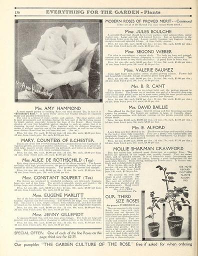 Keywords: Everything for the garden (16391017095).jpg This together with its delicious fragrance <br> makes it without question one of the greatest novelties as well as one of the <br> most distinct Roses that has yet been sent out See cut <br> Price 1st size 75c each 7 50 per doz ; 2d size 60c each 6 00 per doz ; <br> 3d size from 3-inch pots 25c each §2 50 per doz <br> MARY COUNTESS OF ILCHESTER <br> This is one of the best ever-blooming Roses considered from the standpoint of <br> vigorous growth and sound healthy constitution The flowers are of great size <br> with large massive petals; delicately tea perfumed and borne on long straight <br> stems The color is a rich warm carmine-crimson <br> Price 1st size 60c each 6 00 per doz ; 2d size 50c each 5 00 per doz ; <br> 3d size from 3-inch pots 25c each 2 50 per doz <br> Miss ALICE DE ROTHSCHILD Tea <br> Rich deep citron-yellow which intensifies as the bloom expands The flowers <br> are large with high pointed center; the petals charmingly reflex; free and con- <br> tinuous in bloom; deliriously fragrant The growth is vigorous and upright <br> Price 1st size 60c each 6 00 per doz ; 2d size 50c each 5 00 per doz ; <br> 3d size from 3-inch pots 20c each 2 00 per doz <br> Mme CONSTANT SOUPERT Tea <br> The flowers are produced in wonderful profusion are deliriously fragrant <br> large size and of fine form The growth is splendid sturdy and healthy; the <br> foliage large and abundant The color is deep yellow shaded peach <br> Price 1st size 60c each 6 00 per doz ; 2d size 50c each 5 00 per doz ; <br> 3d size from 3-inch pots 15c each 1 50 per doz <br> Mme EUGENE MARLITT <br> One of the best of the newer Roses for garden purposes It is exceptionally <br> healthy vigorous and free blooming The flowers are large very double and <br> full The color is a rich bright carmine with reddish tone and does not fade <br> or bleach in the hottest weather It is quite hardy and delightfully fragrant <br> Price 1st size 60c each 6 00 per doz ; 2d size 40c each 4 00 per doz ; <br> 3d size from 3-inch pots 15c each 1 50 per doz <br> Mme JENNY GILLEMOT <br> A vigorous Hybrid Tea with fine deep green foliage The buds are long and <br> pointed; rich nankeen-yellow changing to saffron-yellow as the flowers develop <br> Price 1st size 50c each 5 00 per doz ; 2d size 35c each 3 50 per doz ; <br> 3d size from 3-inch pots 15c each 1 50 per doz <br> SPECIAL OFFER One of each of the fine Roses on this <br> page; third size for 2 25 <br> MODERN ROSES OF PROVED MERIT - Continued <br> They are all of the Hybrid Tea class except where noted <br> Mme JULES BOULCHE <br> A splendid Rose that should be in every garden; color salmon-white center <br> shaded rose Large and full well formed flowers Just as handsome in the <br> full-bloom flower as in the bud A most prolific bloomer very fragrant Long <br> straight stems and splendid foliage A clean thrifty grower <br> Price 1st size 60c each 6 00 per doz ; 2d size 50c each 5 00 per doz ; <br> 3d size from 3-inch pots 20c each 2 00 per doz <br> Mme SEGOND WEBER <br> The color is rosy-salmon a unique shade The buds are long and pointed <br> opening into enormous blooms deepening in color until fully expanded The <br> texture of the flower is very thick and heavy A grand Rose in every way <br> Price 1st size 60c each 6 00 per doz ; 2d size 50c each 5 00 per doz ; <br> 3d size from 3-inch pots 20c each 2 00 per doz <br> Mme VALERIE BAUMEZ <br> Color light flame with golden center shaded glowing salmon Flower full <br> and beautifully rounded ; foliage beautiful glossy dark green <br> Price 1st size 60c each 6 00 per doz ; 2d size 50c each 5 00 per doz ; <br> 3d size from 3-inch pots 20c each 2 00 per doz <br> Mrs B R CANT <br> This variety is remarkable for its robust habit and the profuse manner in <br> which it blooms The flowers are of medium size and of a beautiful deep rose <br> color on the outer petals quite red in some cases; while the inner petals are soft <br> silvery-rose buff at the base A healthy grower free bloomer <br> Price 1st size 50c each 4 50 per doz ; 2d size 30c each 3 00 per doz ; <br> 3d size from 3-inch pots 15c each 1 50 per doz <br> Mrs DAVID BAILLIE <br> Now offered for the first time Growth strong and free branching; an ideal <br> variety for massing The flowers are medium to large of Camellia shape <br> Color madder-carmine with delicate veinings on the petals penciled with a <br> deeper shade <br> Price 1st size 1 00 each 9 00 per doz ; 2d size 75c each 7 50 per doz ; <br> 3d size from 3-inch pots 30c each 3 00 perldoz <br> Mrs E ALFORD <br> A new Rose now first offered by us The flowers are large and beautiful either <br> in the bud or when fully expanded They are a pretty rosy salmon-pink and <br> delightfully fragrant In shape they resemble the well-known La France but <br> the buds are longer and more pointed <br> Price 1st size 1 00 each; S9 00 per doz ; 2d size 75c each 7 50 per doz ; <br> 3d size from 3-inch pots 35c each 3 50 per doz <br> MOLLIE SHARMAN CRAWFORD <br> This fine variety has achieved great distinction as a garden Rose The <br> flowers are splendid of the largest size grandly formed They are snow- <br> white and of splendid texture It is of admirable habit fast-growing and <br> free-branching; foliage dark and heavy forming a good background for the <br> snow-white flowers Stems strong holding the flowers erect It blooms very <br> freely and is delightfully fragrant <br> Price 1st size 60c each 6 00 <br> per doz ; 2d size 40c each 4 00 W 4 SEE NOTE <br> per doz ; 3d size from 3-inch W\V REGARD- <br> pots 15c each 1 50 per doz V – - ” INGTHESE <br> We received the seeds and \ / PLANTS <br> plants in good condition The \f ” ~ ADJOIN <br> Roses were exceptionally fine ~ Fr ' <br> They were not withered at all 't- -Li r ” <br> We have them planted and they <br> are doing nicely Thank you for <br> the extra ones you sent <br> Mrs A L FREY <br> Elizabethlown Pa <br> OUR THIRD <